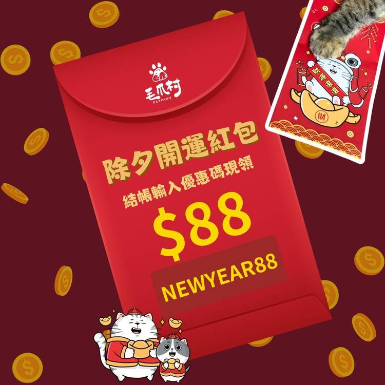 🧧新年驚喜來拉🧧 毛爪村$𝟖𝟖紅包送給您 祝毛爸媽這一年都發!! 領取/使用方法: ①先領取紅包👉https://bit.ly/4dAGofi ②結帳時輸入優惠代碼【NEWYEAR88】 ③紅包使用期限1/28-1/29 *不限消費金額 *限首次購買使用