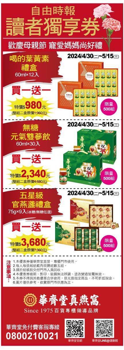 年終最後一波-節後大出清 買一送一限量優惠開搶! 葡萄糖胺龜鹿四珍飲買10盒再送1盒 喝的葉黃素 買一送一 五星級官燕盞6入 買一送一 眾多商品,即刻現搶! 🛒門市哪裡有看這邊:https://reurl.cc/xLKyXb 🛒超值優惠活動限量特惠中:https://reurl.cc/xLvggE 華齊堂官網新會員註冊再享100元折扣喔 (限官網使用,實體通路恕不配合)