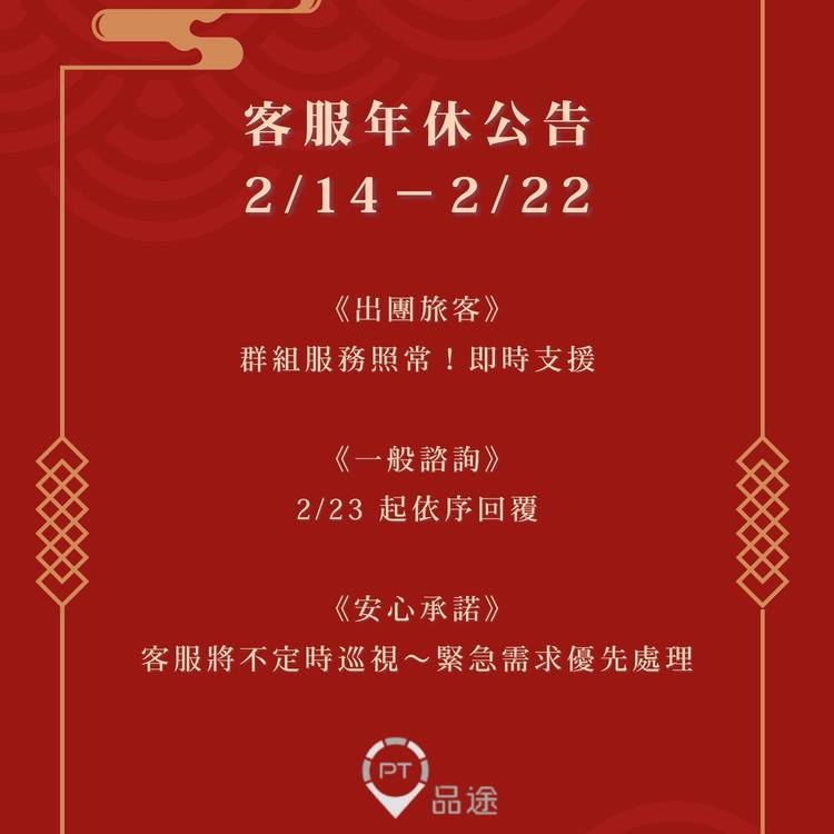 【 客服休息公告|服務不中斷,安心出遊去】 各位旅友大家好! 為了讓團隊充電提供更好的服務,我們將於 2/14 (六) - 2/22 (日) 暫停常態客服服務。 雖然辦公室休息,但我們的守護不打烊: ✅ 已出團旅客: 請放心!「專屬出團群組」服務照常運作,旅途中如有即時需求,請直接在群組聯繫,專員們將盡快回覆您。 📩 一般諮詢: 歡迎先行留言,我們將於 2/23 (一) 起依序回覆。 �...