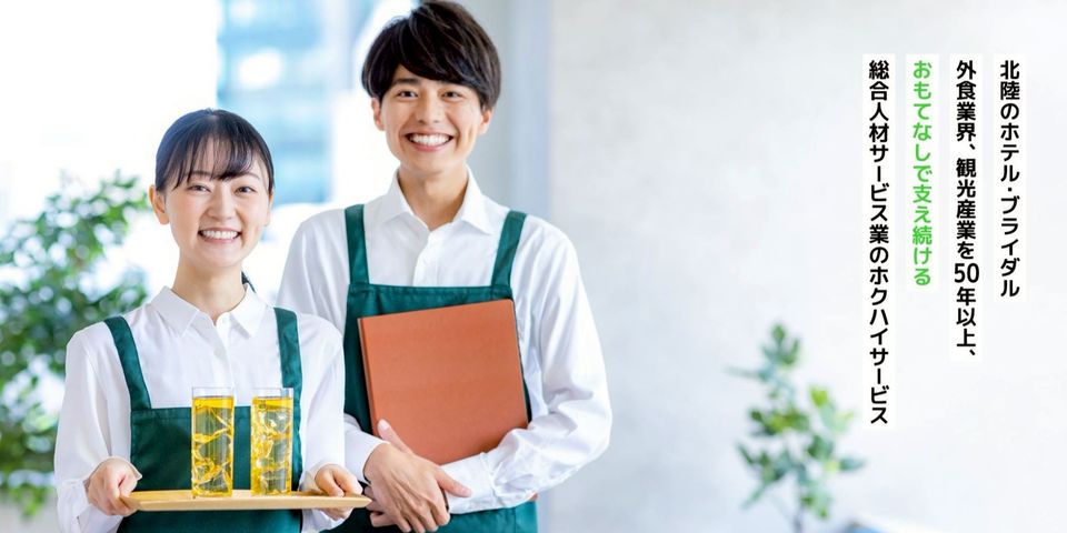 ホクハイサービスは、ハイレベルなサービスを提供する「サービスクリエーター」を養成し、一流ホテルや料亭、結婚式場にご紹介し続けている創業50年以上の金沢の総合人材サービス会社老です。【「ホクハイサービス」が選ばれる理由】 理由1 充実の研修制度があります! 理由2 楽しい仲間がたくさんいます! 理由3 あなたにぴったりの職場をお探しします! 【取扱い職種紹介】 一流ホテルや料亭、旅館、結婚式場など、金沢市内勤務地多数ご用意! その他に福井県、富山県や郊外の加賀市・白山市のホテル、料亭、旅館等の勤務地も多数掲載!