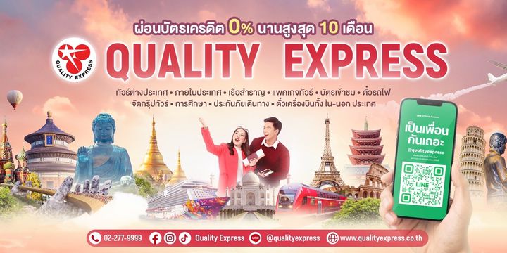 No. 11/02024 เที่ยวทั่วไทย ไปทั่วโลกกับควอลิตี้ เอ็กซ์เพรส บริการจำหน่ายทัวร์ ตั๋วทุกสายการบินทั่วโลก ด้วยราคาประทับใจ เต็มคุณภาพ>> ติดต่อจองทัวร์ ตั๋ว แพคเก็ตอิสระ บัตรเข้าชม www.qualityexpress.co.th