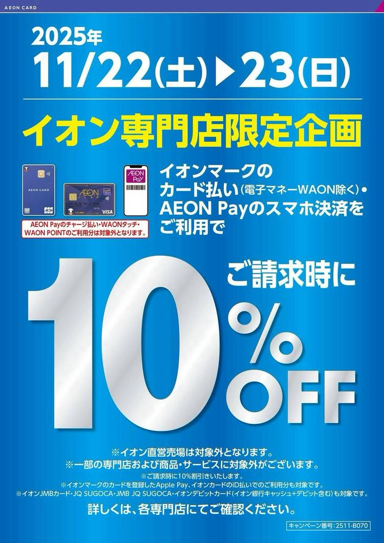 12/6(土) 有家ツインプラザ専門店 お買物券・ご飲食券 7,000円分(500円券×14枚)を5,000円で販売 先着200セット限り!お1人さま3セット限り‼️ ※小学生以下のお子さまはご遠慮ください。 ※お買物券は、イオン直営売場・Aコープありえ、一部専門店ではご利用できません。 ◆販売時間:午前9時30分〜 販売数量無くなり次第終了させていただきます。 ◆お買物券ご利用期間:2025年1...