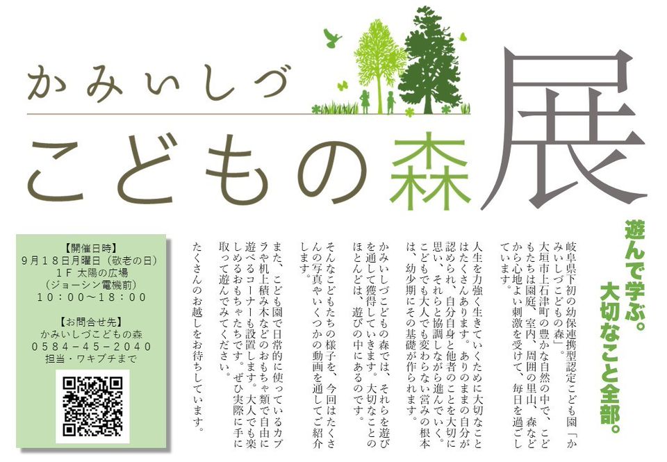 岐阜県大垣市の認定保育園(27年度より幼保連携型認定こども園に移行予定)・かみいしづこどもの森の公式LINEです。おしらせや日常の様子を適宜配信致します。 保護者の方、入園を検討されている方、その他どなたでも登録可能です。お気軽に登録してください。 ※公序良俗に反するあるいは不適切とこちらが判断させていただいたアカウントについては、事前の通告なしに削除させていただくことがありますので、あらかじめご了承ください。
