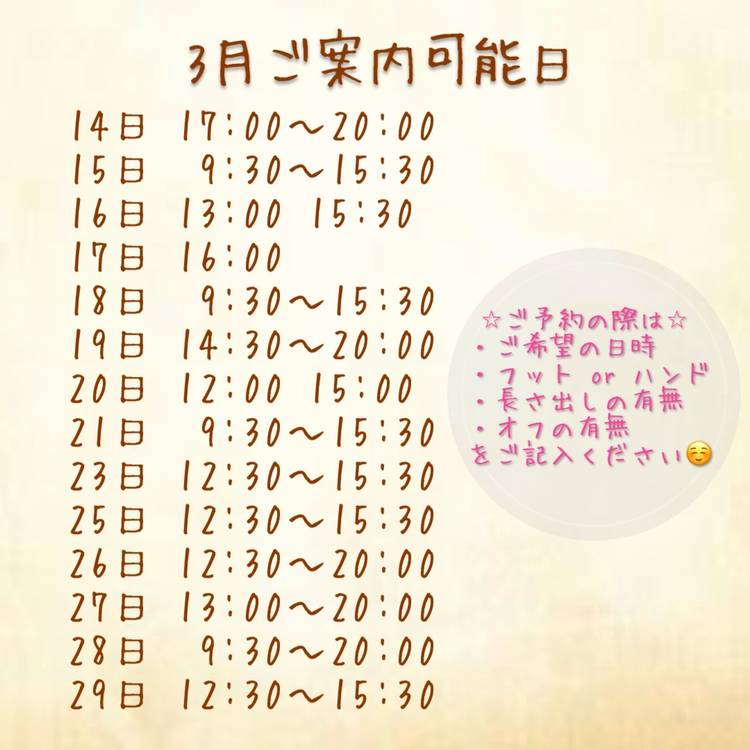7月営業日はこちら💁♀️ 詳しい空きは 4日(木)15:30 5日(金)9:30(10:00) 6日(土)9:30(10:00) 7日(日)9:30 15:30 8日(月)12:30 15:30 9日(火)9:30 15:30 18:00(20:00〜) 11日(木)9:30〜14:30 15日(月)12:30(13:00) 15:30