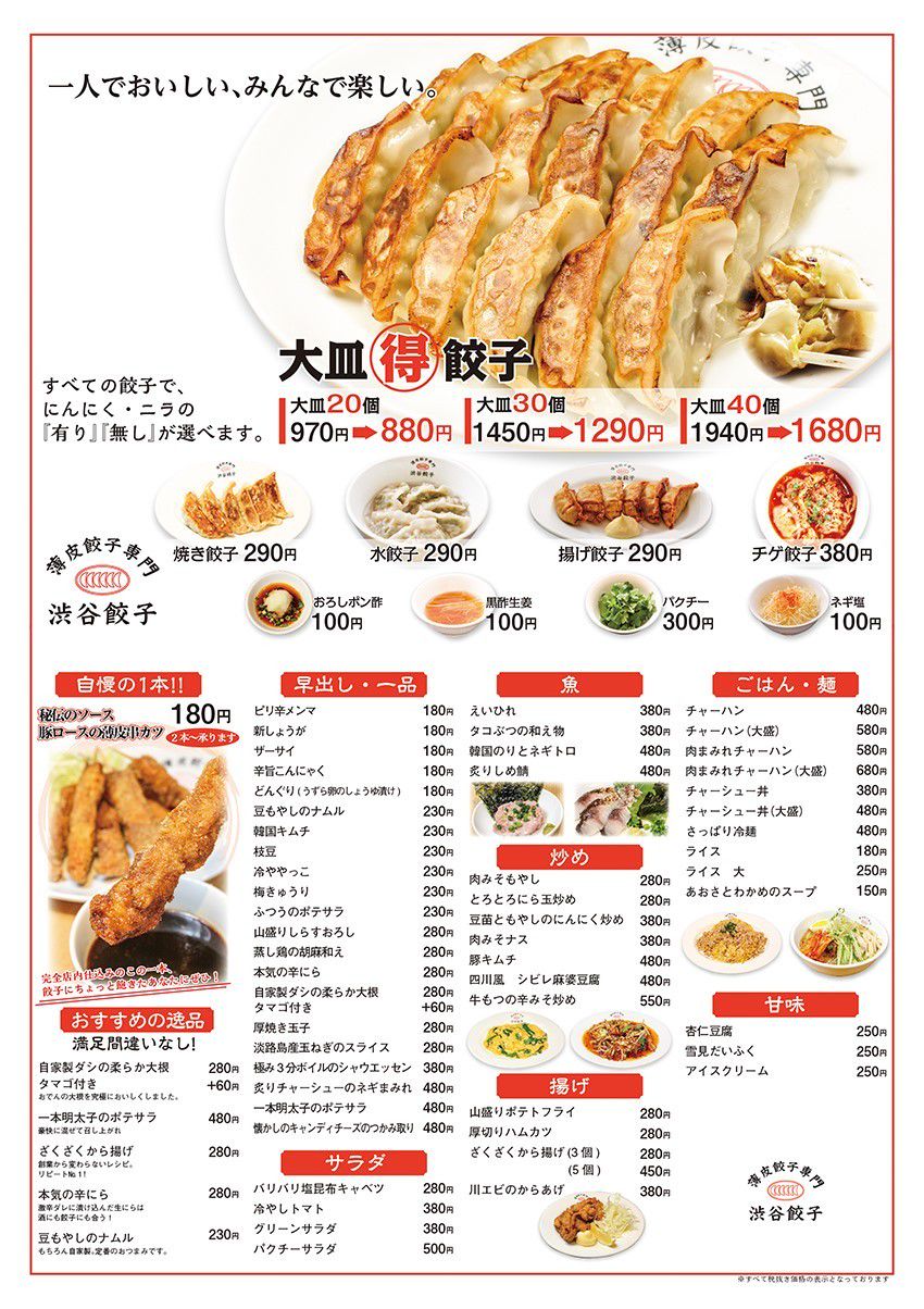 1人でもおいしい、皆で楽しい渋谷餃子をテーマに、渋谷本店、恵比寿店、新宿西口店、新宿3丁目店、川崎店の5店舗で営業しております!食べてもよし!飲んでもよし!の安心価格で皆様のご来店を心よりお待ちしております。
