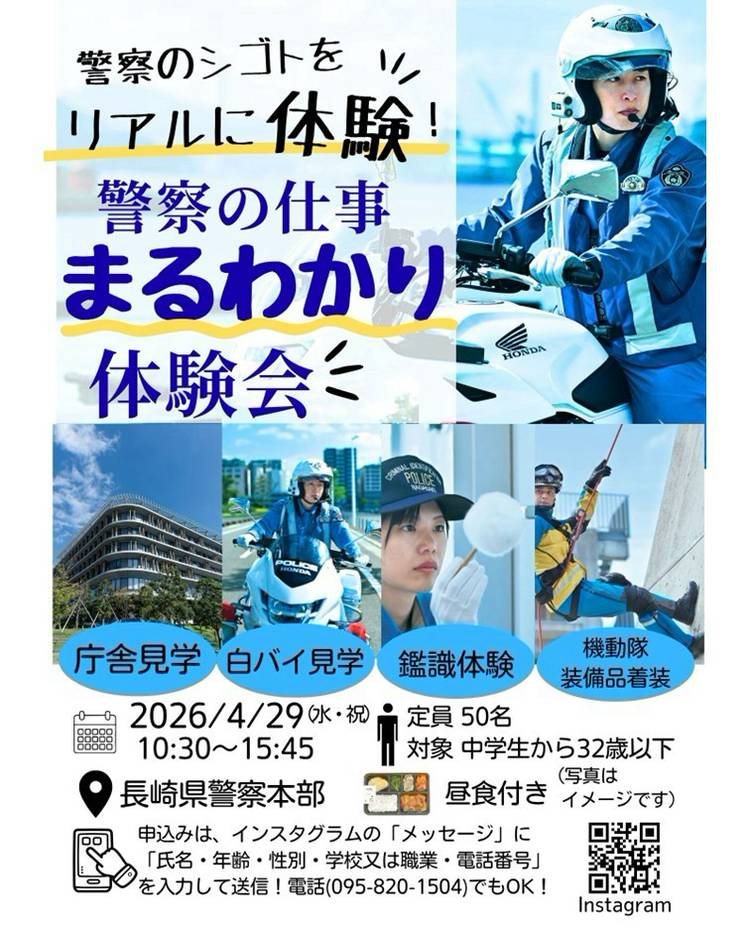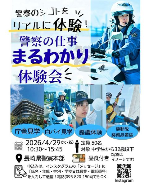 長崎県民の安全・安心を守るため、治安の維持等の活動を行っています。 学歴・性別に関係なく、努力と実力次第でキャリアアップが可能です。 出産、育児休業等の制度が充実しており、女性の方でも安心して働くことができます。定時退庁・積極的な休暇の取得を励行する等、ワークライフバランスの構築に努めています。 ※留意事項 一部のソーシャルネットワーキングサービス(SNS)は、当該SNSの「ボタン」等が設置されたウェブサイトを閲覧した場合、当該「ボタン」等を押さなくとも、当該ウェブサイトからSNSに対し、ユーザーID・アクセスしているサイト等の情報が自動で送信されていることがあります。詳しくは、「SNSの利用者の皆様への留意事項」(個人情報保護委員会HP)(http://www.ppc.go.jp/news/careful_information/sns_button_life/)を御覧ください。 なお、当サイトで利用している他のソーシャルメディア等のサービスのプライバシーポリシー等は、各事業者のサイト等で御確認ください。