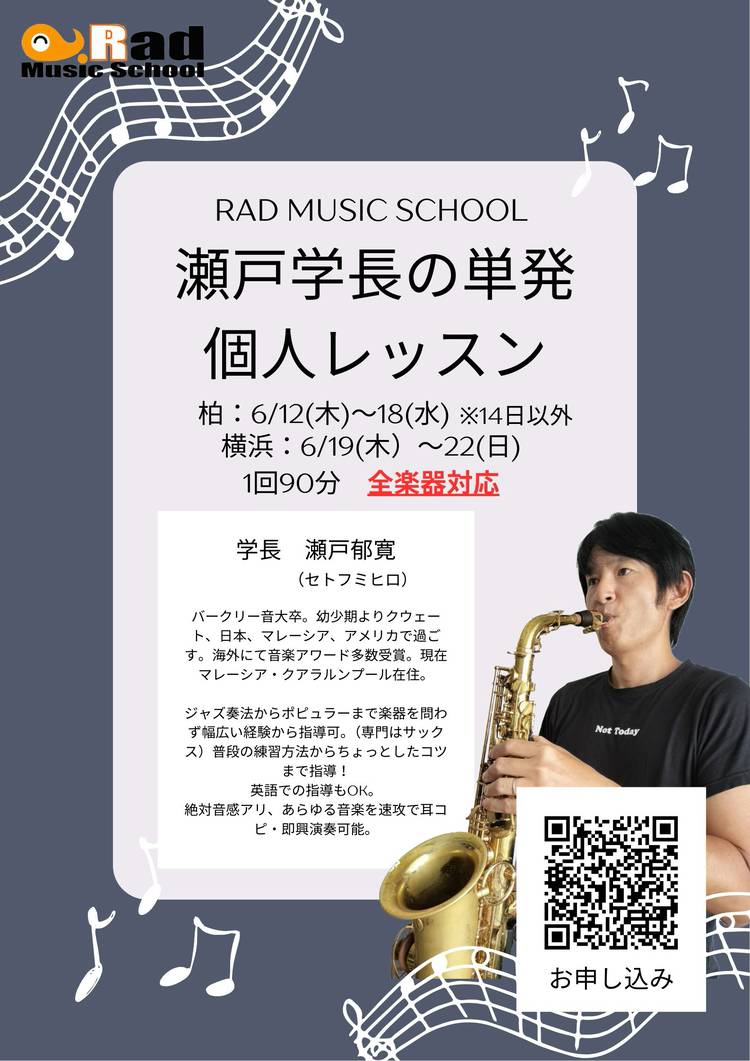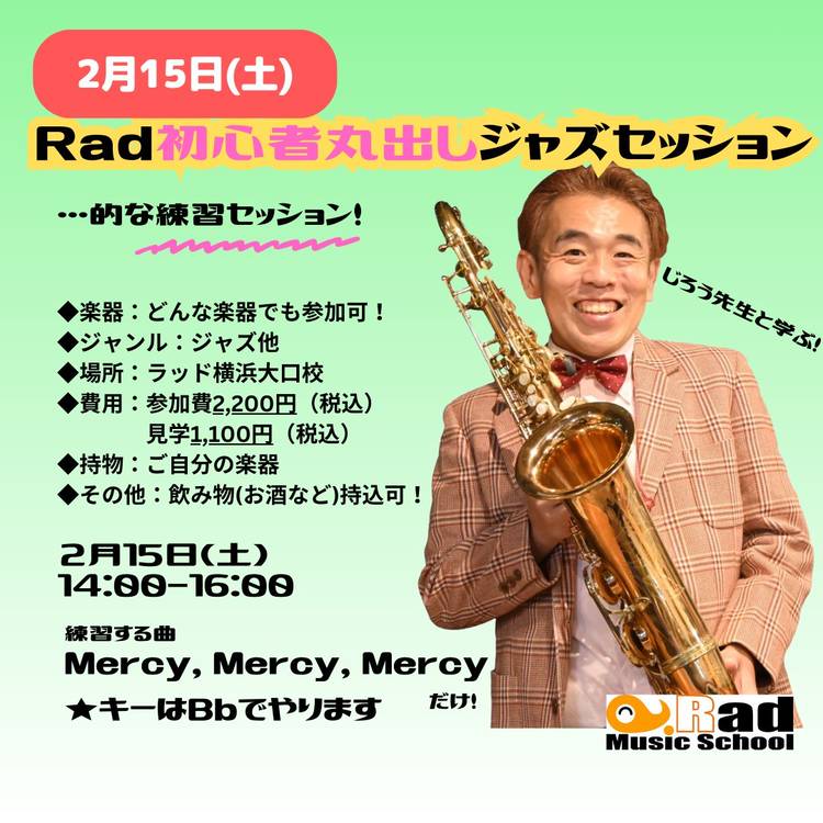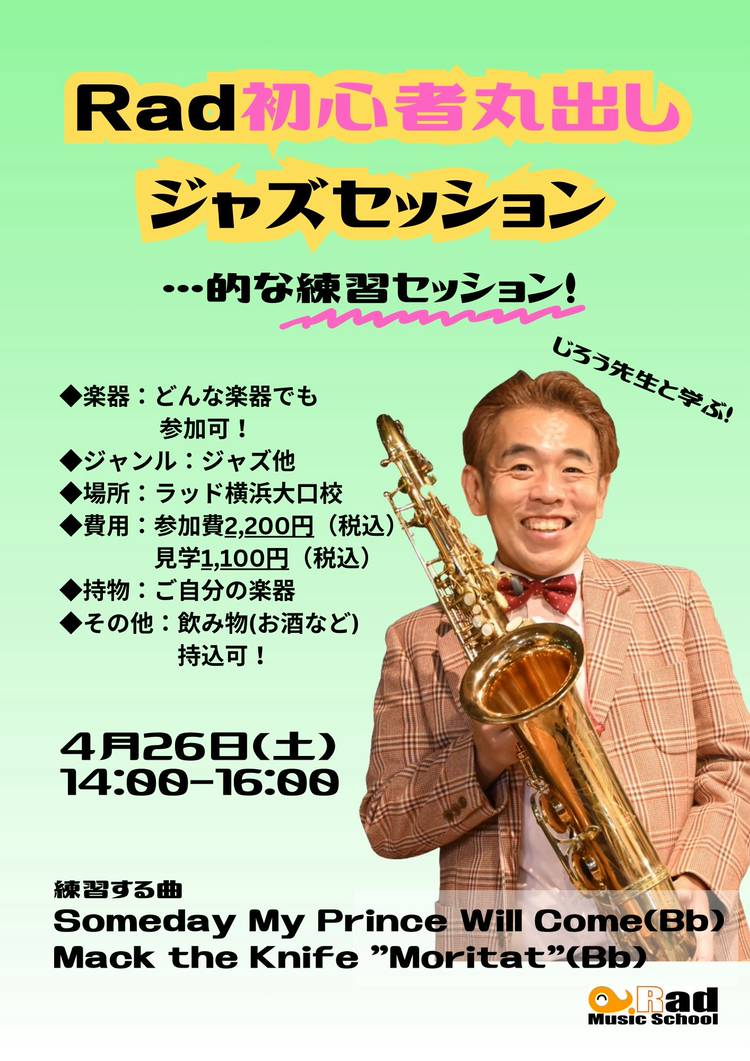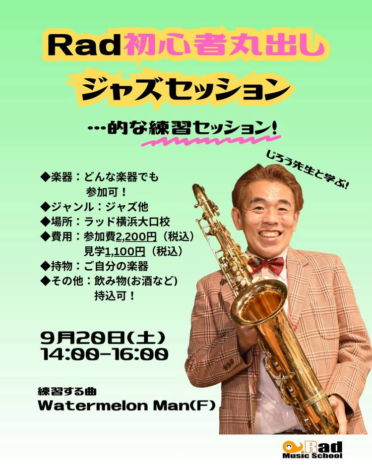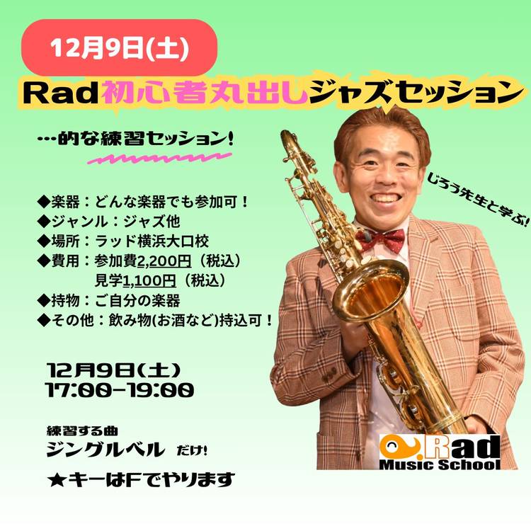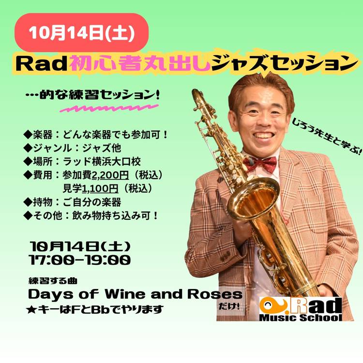 Rad横浜初心者丸出しジャズセッション…的な練習セッション11月 【日時】 2025年11月29日(土) 14:00~16:00 【場所】 ラッドミュージックスクール横浜大口校 神奈川県横浜市神奈川区大口通135-9-201 (ビルの2階です) 【練習する曲】 Autumn Leaves(Gm) 【対応楽器】 全楽器参加可能 【参加費】 参加者 2,200円 見学者 1,100円 ※お支...