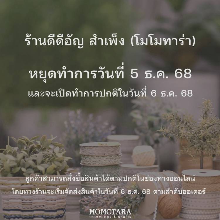 ตลอดหลายปีที่ผ่านมา โมโมทาร่า ได้ผลิตริบบิ้น เชือกเกลียว ชายครุย ลูกไม้ และตัวประดับหลากหลาย รูปแบบ เพื่อให้ช่างตัดเย็บ นักออกแบบตกแต่ง ผู้ผลิตของขวัญ และลูกค้าที่รักงานฝีมือ ได้เลือกนำไป สร้างสรรค์ผลงานตามจินตนาการอย่างไม่จำกัด จนถึงวันนี้ผลิตภัณฑ์ของเราได้ไปประกอบอยู่กับเสื้อผ้า เครื่องแบบ เครื่องประดับ เครื่องนอน ของขวัญ และของตกแต่งในงานพิธีหรือเทศกาลต่างๆ มากมาย เราตื่นเต้นทุกครั้งที่เห็นใครใช้ทริมเล็กๆ เหล่านี้ไป ตกแต่งบนสิ่งของต่างๆ เพื่อแสดงถึงความเป็น ตัวของตัวเอง เรามีความสุขทุกครั้งเมื่อเห็นใครตั้งใจ ตกแต่งการ์ดหรือประดิษฐ์ของขวัญเพื่อมอบให้คนพิเศษ เพราะนั่นคือการส่งความรู้สึกที่เรียบง่ายอันแสนวิเศษ และเราอิ่มเอมใจที่เห็นใครหลายคนชวนกันมานั่งล้อมวง ทำงานคราฟต์เพื่อพัฒนาตัวเองไปพร้อมกับการ แลกเปลี่ยนเรื่องราวชีวิตของกันและกันอย่างสนุกสนาน เราดีใจที่ โมโมทาร่า เป็นส่วนหนึ่งของภาพเหล่านั้น For decades, MOMOTARA has been manufacturing narrow fabrics such as ribbons, twisted cords, laces, fringes and appliques catering for satorialists, decorators, gift makers and craft lovers to create artworks of infinite possibilities. Today our products are seen adorning anywhere from fashion to uniform, accessories to bedding, ceremonial to festive. we get excited every time when someone deliberately adds little trims onto personal objects to fit their own chosen lifestyle. We are always delightful that hand-decorated cards or DIY gifts are given as the purest expression of good thoughts. Moreover, we feel truely blessed to see friends huddling up for craft practising pastime while sharing life bits to one another. it’s mere joy when MOMOTARA can be a part of those scenes.