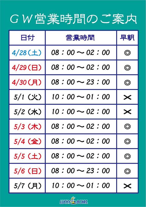 営業時間 平日 10:00~深夜1:00 日曜・祝祭日(連休最終日) ~23:00 日曜・祝祭日前夜 ~深夜2:00 土曜・日曜・祝祭日は8:00より早朝ボウル! 2F18レーン 4F18レーン 計36レーン 駐車スペース 40台 駐車サービスあり