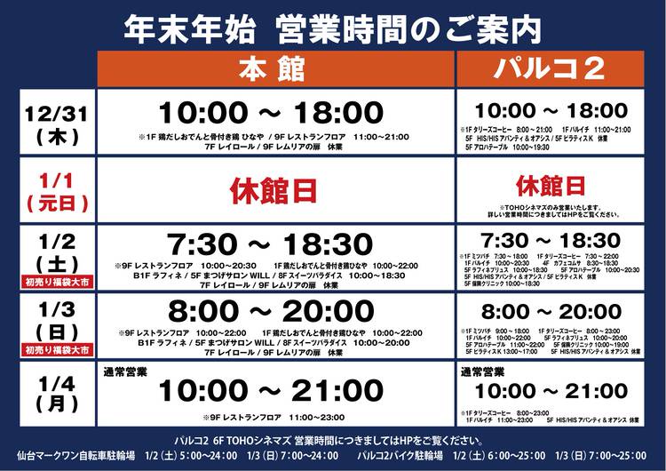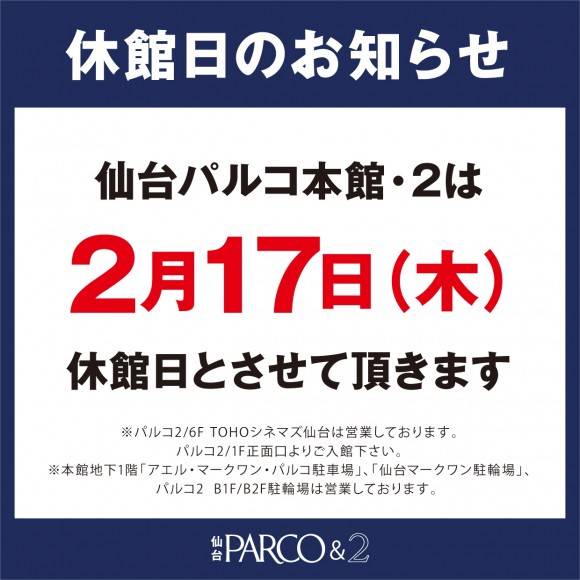 平素は仙台パルコをご愛顧頂き誠にありがとうございます。 仙台パルコ本館・パルコ2は2月17日(木)は全館休館日とさせて頂きます。 ◆日時:2月17日(木)終日 ◆対象:仙台パルコ 本館、パルコ2 ※パルコ2・6F TOHOシネマズ仙台は通常通り営業いたします。 営業時間については、下記HPからご確認下さい。 https://hlo.tohotheater.jp/net/schedule/078...