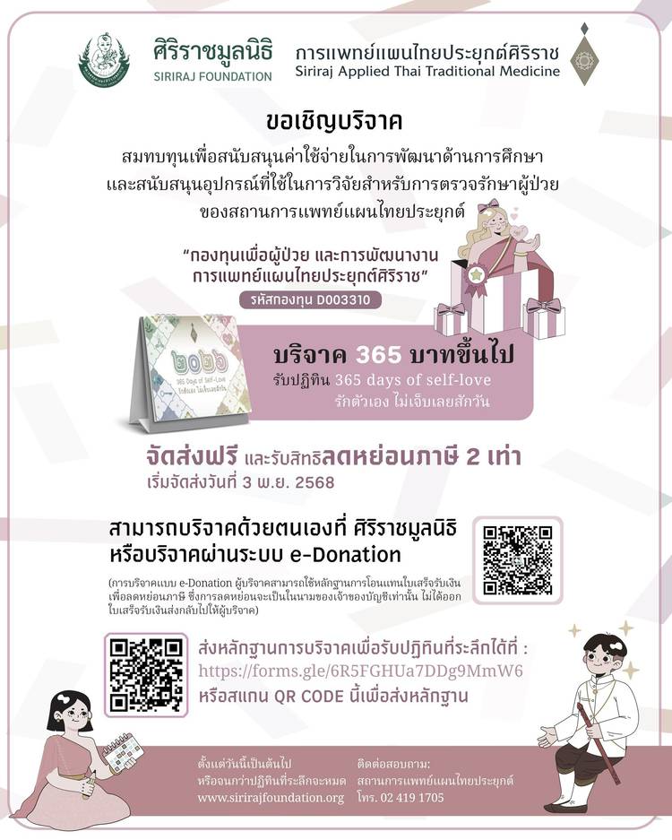 🩵 ขอเชิญบริจาคสมทบทุนเพื่อสนับสนุนค่าใช้จ่ายในการพัฒนาด้านการศึกษาและสนับสนุนอุปกรณ์ที่ใช้ในการวิจัยสำหรับการตรวจรักษาผู้ป่วยของสถานการแพทย์แผนไทยประยุกต์ “กองทุนเพื่อผู้ป่วยและการพัฒนางานการแพทย์แผน...
