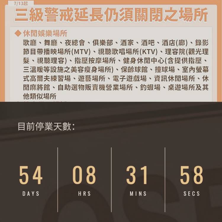今天是不得營業的第54天。 中央流行疫情指揮中心今(8)日表示,在國人共同努力配合下,國內疫情已在控制中,惟仍有部分感染事件發生,參酌世界各國管制作為及經驗,防疫措施鬆綁須逐步執行,才可穩定掌握疫情狀況,為確保國人健康,指揮中心經評估後決定,同步延長全國疫情警戒第三級至7月26日止。 https://www.cdc.gov.tw/ https://teabeer-tainan.carrd.co...