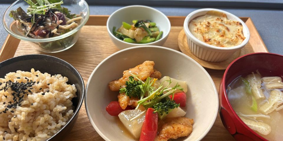 1200yen。 1/16(金)~1/22(木) ○冬野菜と塩こうじ鶏胸肉の柚子あん酢豚風 ○さつま芋ときのこ豆乳グラタン ○菊芋と小松菜のきんぴら ○旬野菜サラダ ○冬野菜の味噌汁 ○玄米ごはん ※白ごはんもご用意出来ます。