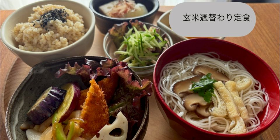 次回、玄米定食の献立のお知らせです(4/3 - 4/9) 〇サーモンフライに新玉葱などのスイートチリソース 〇こうや豆腐煮物 〇三輪素麺の煮麺 〇サラダ 〇玄米ごはん ※白ごはんも出来ます、お申し下さいませ。 + 本日のケーキ + セットドリンク 自家製ジンジャーレモンソーダ、挽きたてアイスコーヒー他