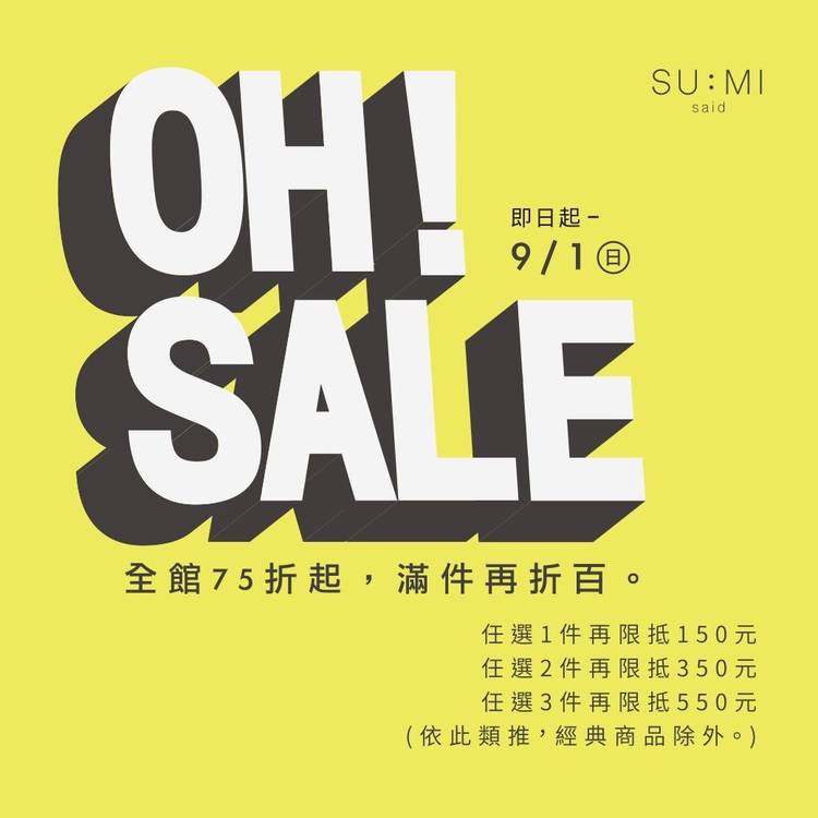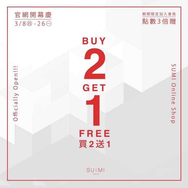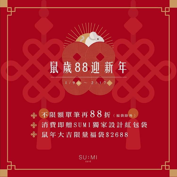 鼠歲88迎新年|限量福袋發售中 1/9(四)-2/17(一) ▪ 不限金額單筆再88折。(福袋商品除外) ▪ 消費即贈SUMI獨家設計紅包袋(市值NT$168)一組,數量有限,送完為止。 ▪ 鼠年大吉超值福袋NT$2688限量發售。(內含一組抽獎序號及紅包袋一組,最大獎不限金額任選SUMI品牌商品一件) ▪ 台/港/澳/日本地區不限額享免運優惠。 🎁福袋購買連結 / https://bit.l...
