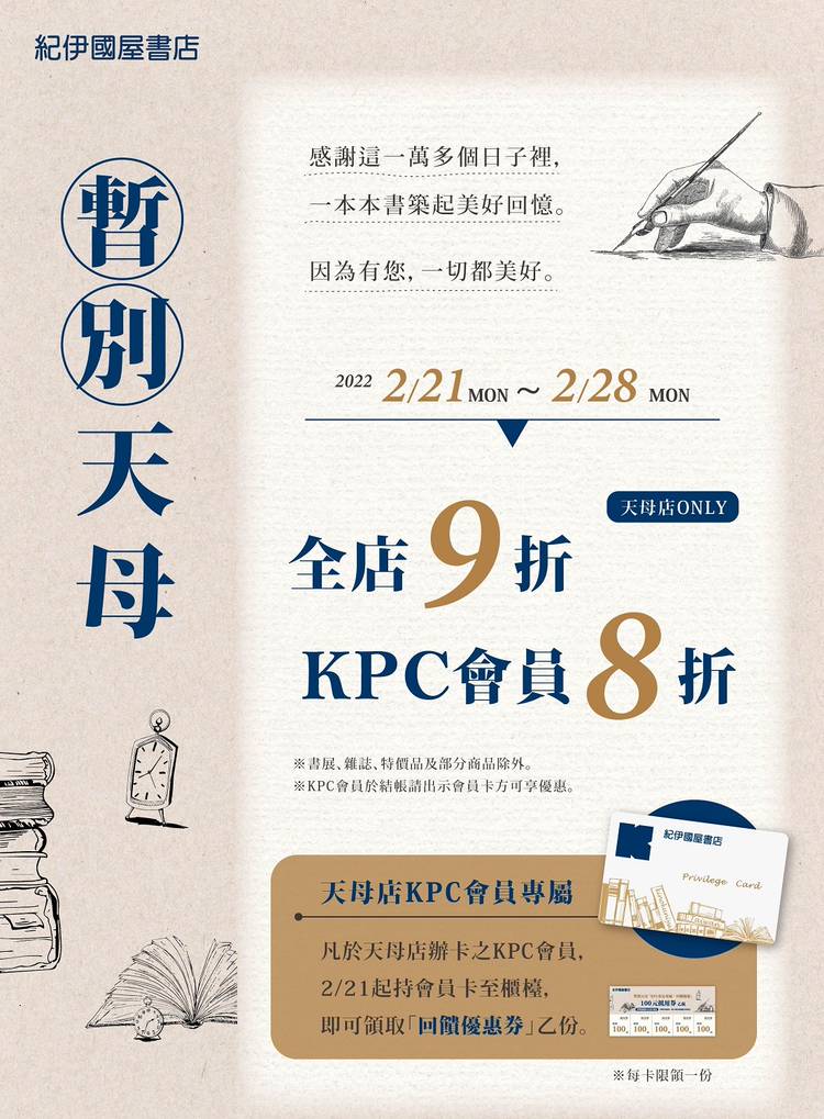 為提供讀者朋友們更卓越的服務和商品內容,以及嶄新優質的購書環境,台北天母店於2014年暑假進行改裝,9月12日新妝開幕,從大葉高島屋百貨12F遷至4F ,呈現豐富多元的中、英、日文書籍雜誌,打造兒童閱讀區,並引進日本文具雜貨商品。 書店設計以「花園」為主題,草綠純淨色系帶來清新感,打造舒適自在的挑高空間。邀請您走入花園書叢中,打造屬於自己的書香芬多精時光。
