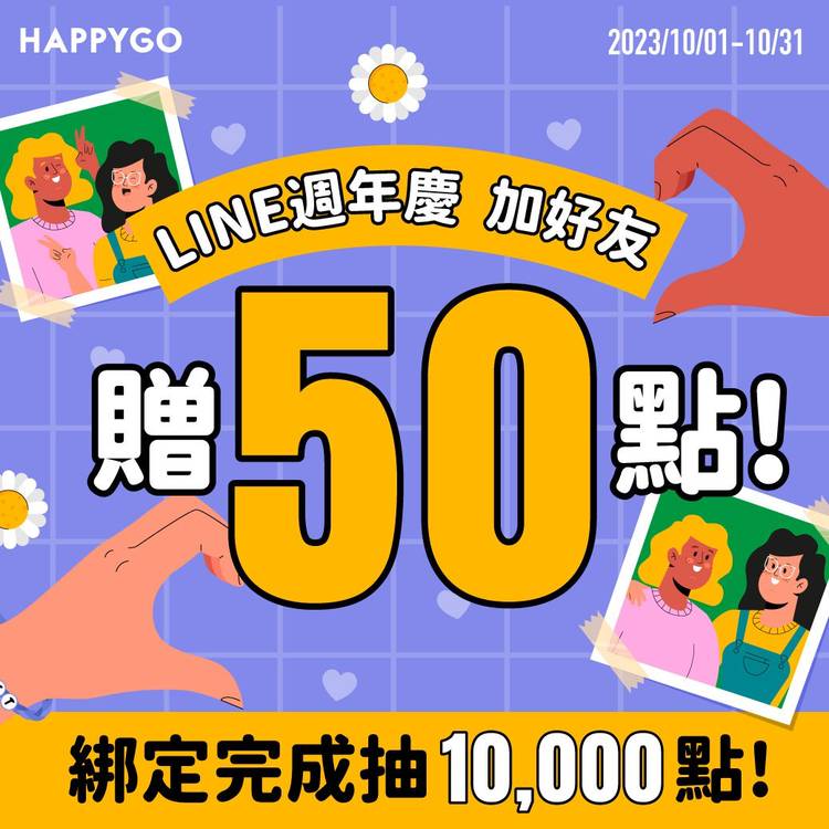 ► 第一重:完成HAPPY GO X LINE官方帳號 好友綁定『贈50點』! (限量前6,000名) ► 第二重:綁定有禮:9月抽 1萬點(乙名) ► 第三重:LINE好友專屬『每月7日簽到任務』 (共50,000名) ► 第四重:LINE領紅包贈10點 (共10,000名) ► 第五重:LINE好友專屬,兌點任務抽990點! 活動詳情:https://bit.ly/3su7UZy