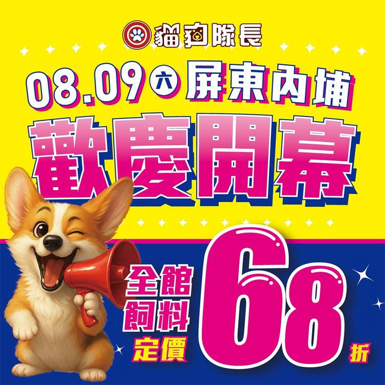 🔥就是明天🔥貓狗隊長屏東內埔店 8/9 11:00 強勢開幕🐾🔥 #全館飼料定價68折 #雞腿1支29元 #CIAO肉泥1包33元 #汪喵_洛格_貓砂單包98元 #Sheba_袋鼠廚房_限量加碼9元 超值優惠千萬別錯過!我們明天不見不散!🎉 🎁【 開幕首2日 #神級優惠11點準時開戰 】 🛍️ 千元神組合→#199元貓狗大禮包(飼料+零食+玩具) 🦴 固牙好厲害→#韓國多效...