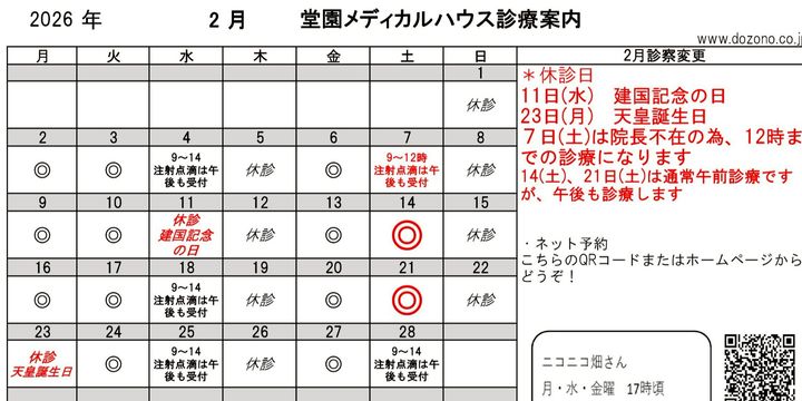 令和8年2月の診療案内です。