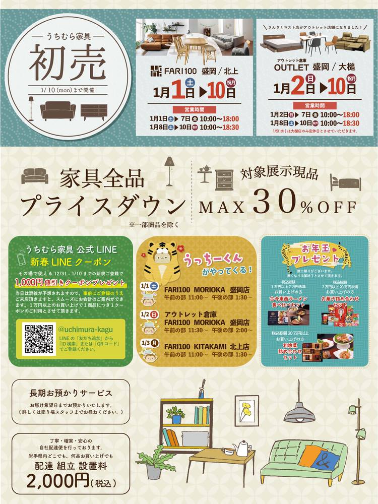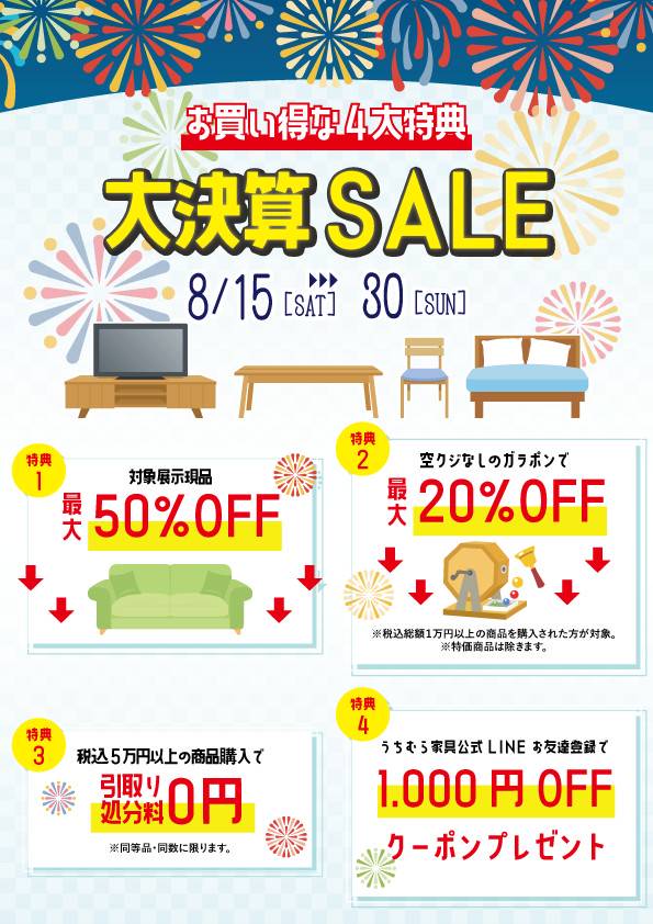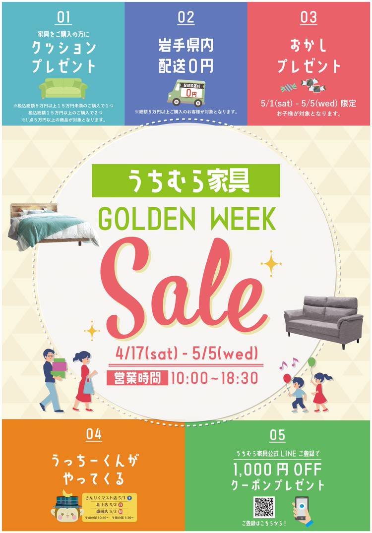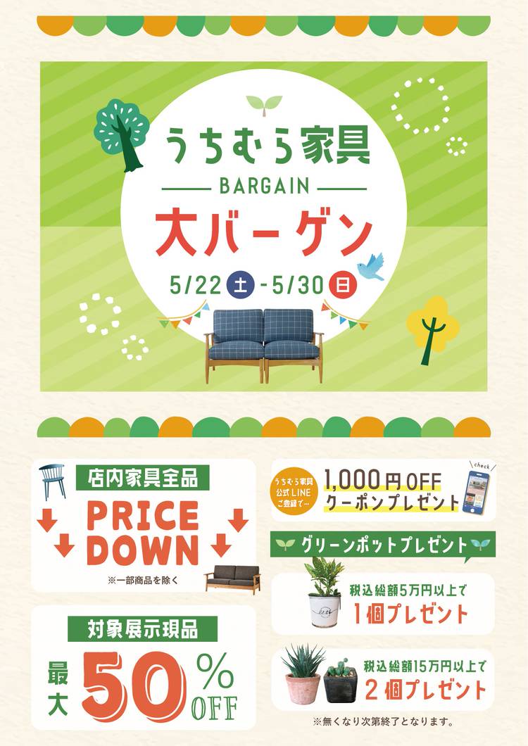 🏡新築・買替キャンペーン 5/21(土)~5/30(月)までうちむら家具全店にて 「新築・買替キャンペーン」を開催いたします。 期間中は 新築・リフォーム中のお客様(マンションもOK)に 7/31(日)まで 何度でも使える 『5%OFFクーポン』をプレゼント! ※クーポンの配布は5/30(月)までとなっております。 ※税込1万円以上のお買い物でご利用頂けます。 ※セール価格品・特価品には...