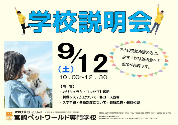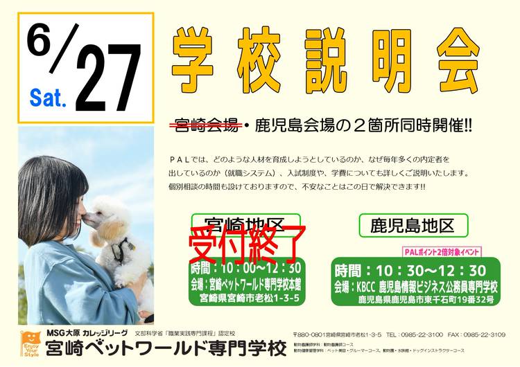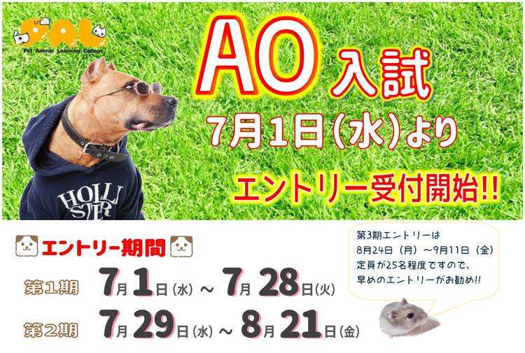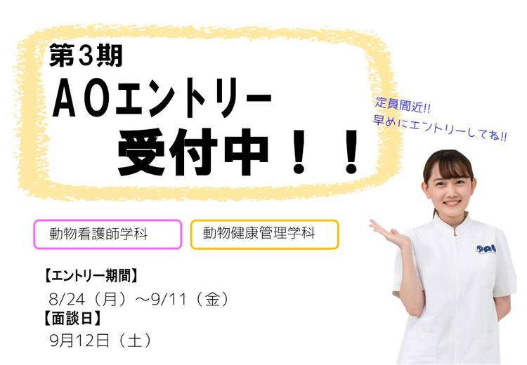 現在、AOエントリーの第2期受付期間です。 受付期間は7月29日(水)~8月21日(金)迄です。 本校のAOエントリーには募集定員がございますので、第2期までに募集定員に達した場合には、第3期を中止にする事もございます。 第3期にエントリーする予定の方で、まだ本校へ連絡をしていない方は一度本校までご連絡をお願いいたします。 その他、ご不明な点がございましたらお気軽に下記までお問合せください。 宮...