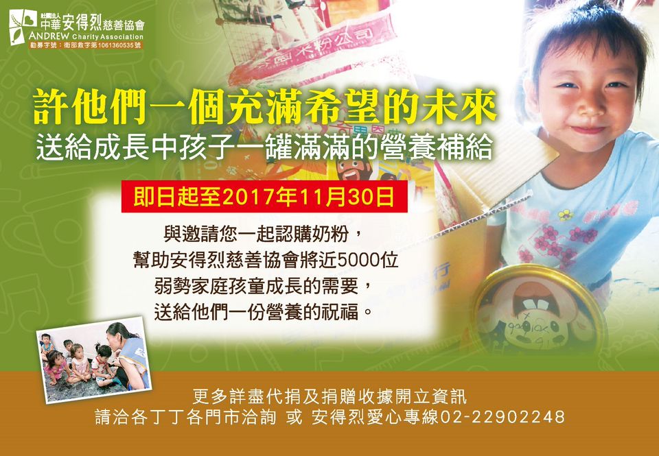 社團法人中華安得烈慈善協會自 2011 年底成立,主要藉由推動「安得烈食物銀行」計劃,將最方便食用與長期保存的食物組合成「膳糧食物包」,援助在成長階段(0-15 歲)的貧困學童。藉中長期關懷為主、輔以食物包援助,以達協助清寒及弱勢家庭孩童能健康成長免於飢餓;另一方面也幫助其家庭度過困境,找回重新出發的力量。