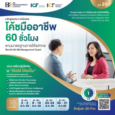 🌟 หลักสูตร ICF Coach Mentoring Program for ACC/PCC รุ่น 20 หรือหลักสูตรพี่เลี้ยงสำหรับผู้ที่ต้องการสอบใบรับรองคุณวุฒิด้านการโค้ช ระดับ Associate Certified Coach (ACC)* และ Professional Certified Coach (PCC)** รับรองโดย International Coaching Federation (ICF) หรือสหพันธ์การโค้ชนานาชาติ 🌟 รับเพียงรุ่นละ 10 ท่าน ตามข้อกำหนดของสหพันธ์โค้ชนานาชาติ (ICF) 🌟 🔷 หลักสูตรนี้เหมาะสำหรับ: 🔹ผู้ที่ผ่านการอบรมหลักสูตร ACSTH ที่ได้รับการรับรองโดย ICF มาแล้ว 60 ชั่วโมง (ACC) 🔹ผู้ที่ผ่านการอบรมหลักสูตร ACTP หรือ ACSTH ที่ได้รับการรับรองโดย ICF มาแล้ว 125 ชั่วโมง (PCC) 📍 เรียนสดออนไลน์ผ่าน Zoom 2 วัน + นัดเดี่ยวกับโค้ชพี่เลี้ยง 1 ชั่วโมง x 3 ครั้ง 🗓 ตารางเรียน: 22 พฤศจิกายน 2568 - 22 กุมภาพันธ์ 2569 (3 เดือน ตามข้อกำหนดของ ICF) + ดูแลพิเศษเพิ่มเติมให้อีก 3 เดือน รวมเป็น 6 เดือน 🔶 รูปแบบหลักสูตร: 🔸โค้ชพี่เลี้ยงแบบเซสชั่นเดี่ยว (Individual) 3 ครั้ง ครั้งละ 1 ชั่วโมง รวม 3 ชั่วโมง *นัดเดี่ยวในช่วงระหว่าง 1 ธันวาคม 2568 - 28 กุมภาพันธ์ 2569 (ทาง online) 🔸โค้ชพี่เลี้ยงในการเรียนรู้แบบกลุ่ม (Group Learning) 2 วันเต็ม รวม 12 ชั่วโมง [เสาร์ที่ 22, 29 พฤศจิกายน 2568] 🔸เข้าเรียนรู้เพิ่มเติม ทางระบบ e-learning ได้ตลอดตามเวลาสะดวกของท่าน ตลอด 6 เดือน 🌟 ค่าฝึกอบรม: ✨ราคาปกติ 49,000 บาท (รวมภาษีมูลค่าเพิ่มแล้ว) ✨ศิษย์เก่าสถาบัน BE Management Coach 40,000 บาท (รวมภาษีมูลค่าเพิ่มแล้ว) ติดต่อสอบถามเพิ่มเติม ทาง Line หรือ โทร. 0964146946