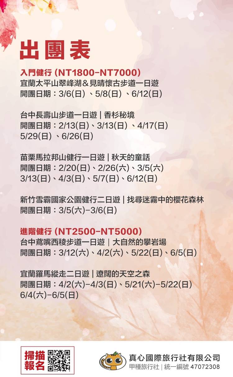 今年的霞喀羅賞楓團名額很搶手 原本準備的名額都快滿了 準備再加開團數,想去手腳要快喔~ 報名連結;https://tttrips.com/themes/syakaro