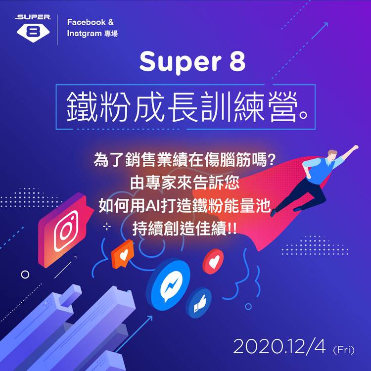 12/4 Super 8 鐵粉增長訓練營(Facebook & Instagram) 專場來啦! 想要節費 Facebook 廣告投放,透過 AI 24/7優化廣告成效,降低訂單成本,提高轉換率。 想要了解 IG 結合聊天機器人如何就消費者的購買週期每個階段分眾優化及管理對話? 正在經營 IG 商家帳號但是不知道如何再優化及增粉? 三大高手(Super 8 x UNH3O x Atelli) 聯...