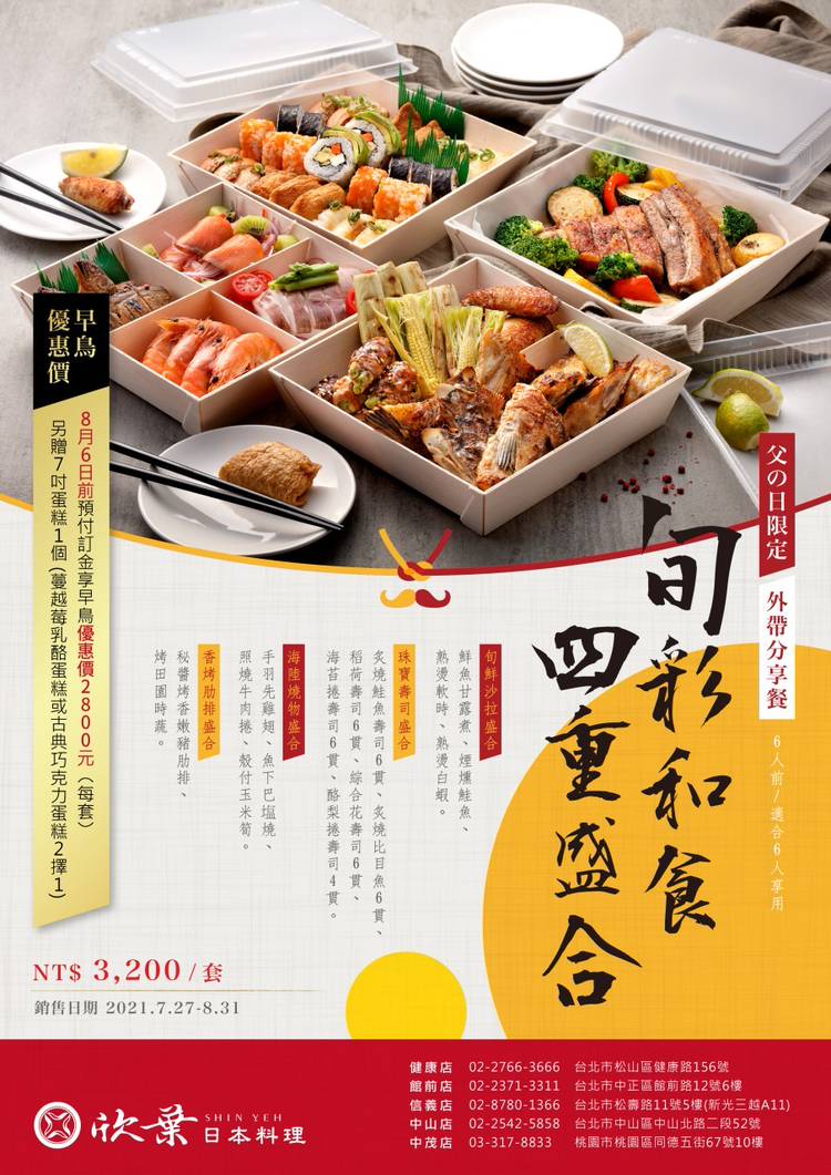 欣葉日本料理 尾牙春酒 ‧ 同享同樂✨ 2022/10/17 ~ 2023/2/24 平日15人同行享2人免費;30人同行享4人免費🔥🔥 10月16日前預付訂金,再送平假日晚餐通用券乙張👍 欣葉日本料理2022年尾牙、2023年春酒專案,搶先開放訂位囉! ◆ 凡是於2022年10月17日 至 2023年2月24日優惠期間內訂位用餐,即可享有「平日15人同行享2人免費;30人同行享4人免...