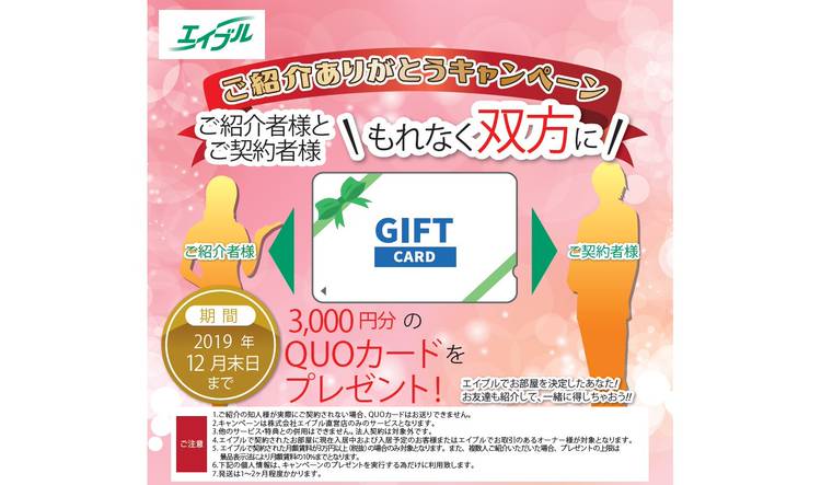 ☆★☆ご紹介ありがとうキャンペーン☆★☆ ご契約者様とご紹介者様双方にQUOカードプレゼント♪ 2020年も毎日営業してます! 南柏駅に来られた際には是非お立ち寄りくださいませ! お問い合わせは→エイブル南柏店 TEL:04-7144-9921 LINE:@uuu2070t HP:https://shop.able.co.jp/000000606...