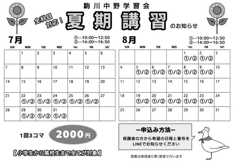 2018年12月1日新規開校の学習塾。 小学生向け1日6名限定個別指導→1コマ500円。毎週月~金17:00~18:45。中学生向け個別指導 →1コマ1000円(50分)。毎週月~土19:00~22:00。詳しくはHPまで。電話:09036235465