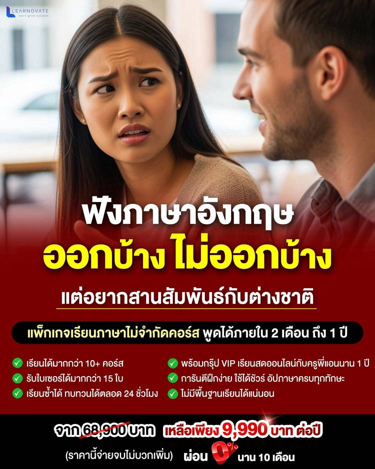 คุยกับฝรั่งไม่รู้เรื่อง? ปัญหานี้ 'เปลี่ยนได้ภายใน 2 เดือน!' อย่าปล่อยให้ความกลัวในการพูดอังกฤษ ทำให้คุณพลาดโอกาสในทุกด้าน! แพ็กเกจ "ภาษาอังกฤษเริ่มจาก 0 จนพูดคล่อง" คือคำตอบที่เร็วและครบที่สุด! ✅...