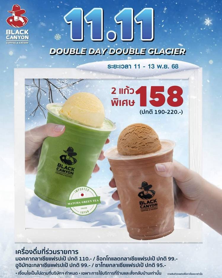 📣 11.11 นี้ Black Canyon จัดให้ Double Day Double Glacier ❄️ จัดเลย! เมนูกลาเซียแฟรปเป้ 2 แก้ว เพียง 158.- (จากปกติ 190-220.-) 🗓️ เฉพาะ 11 - 13 พ.ย. 68 เท่านั้น! เครื่องดื่มที่ร่วมรายการ: มอคคาก...