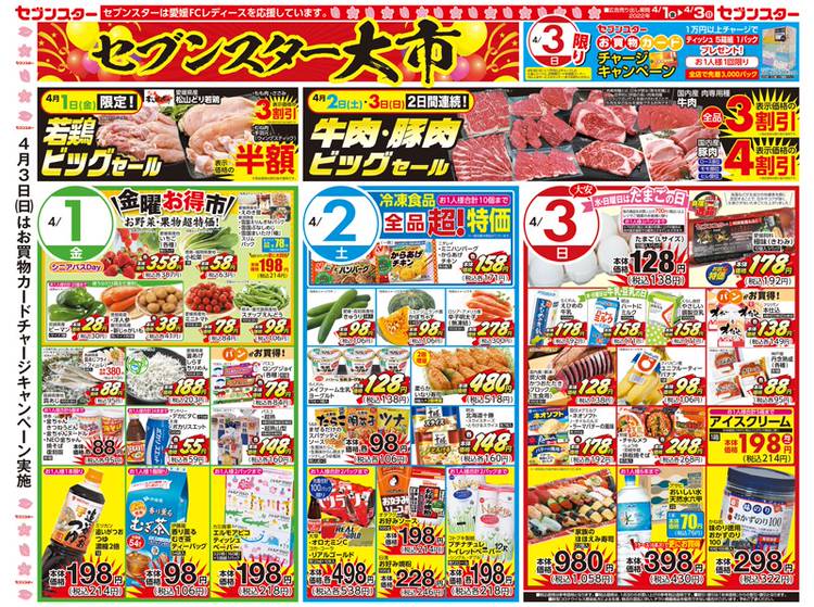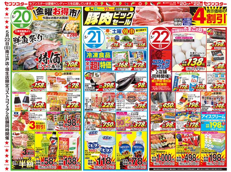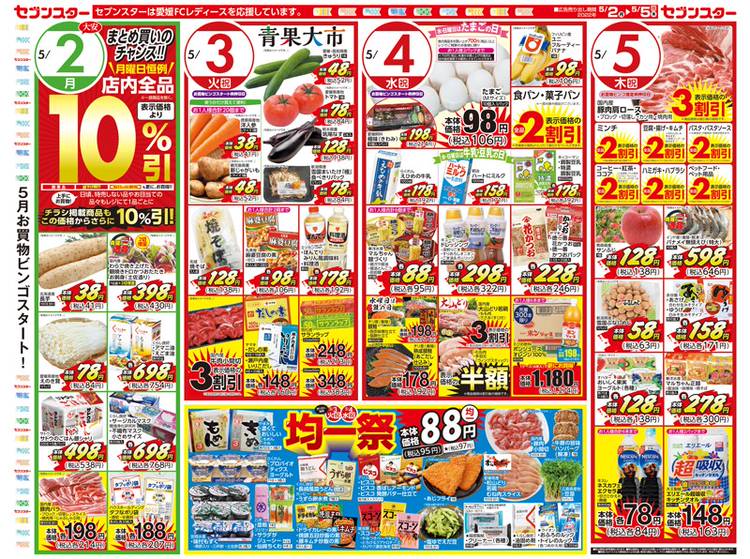 【5/27~5/29のチラシのお知らせ】 セブンスターより明日からのチラシをお届けしました 明日27日(金)は7の付く日7スター感謝DAY本体価格77円の商品や売価の末尾に7の付く商品など、お買得商品が満載また、セブンスターのバイヤーおすすめ!自信の逸品!えびの高原のハム・ウィンナー・ベーコンの4割セールを開催🐷 28日(土)は土曜朝市を開催🥬また、冷凍食品全品超特価セールも...