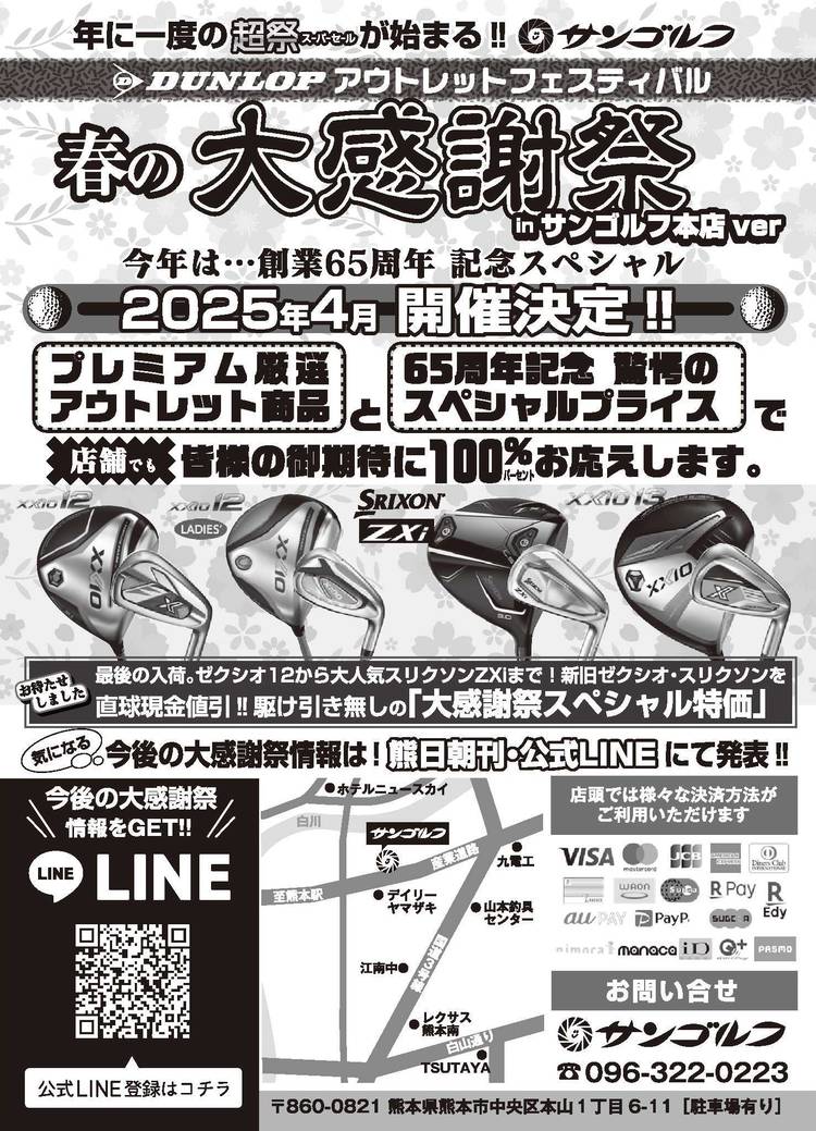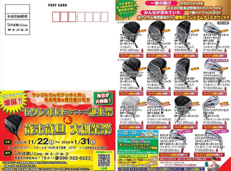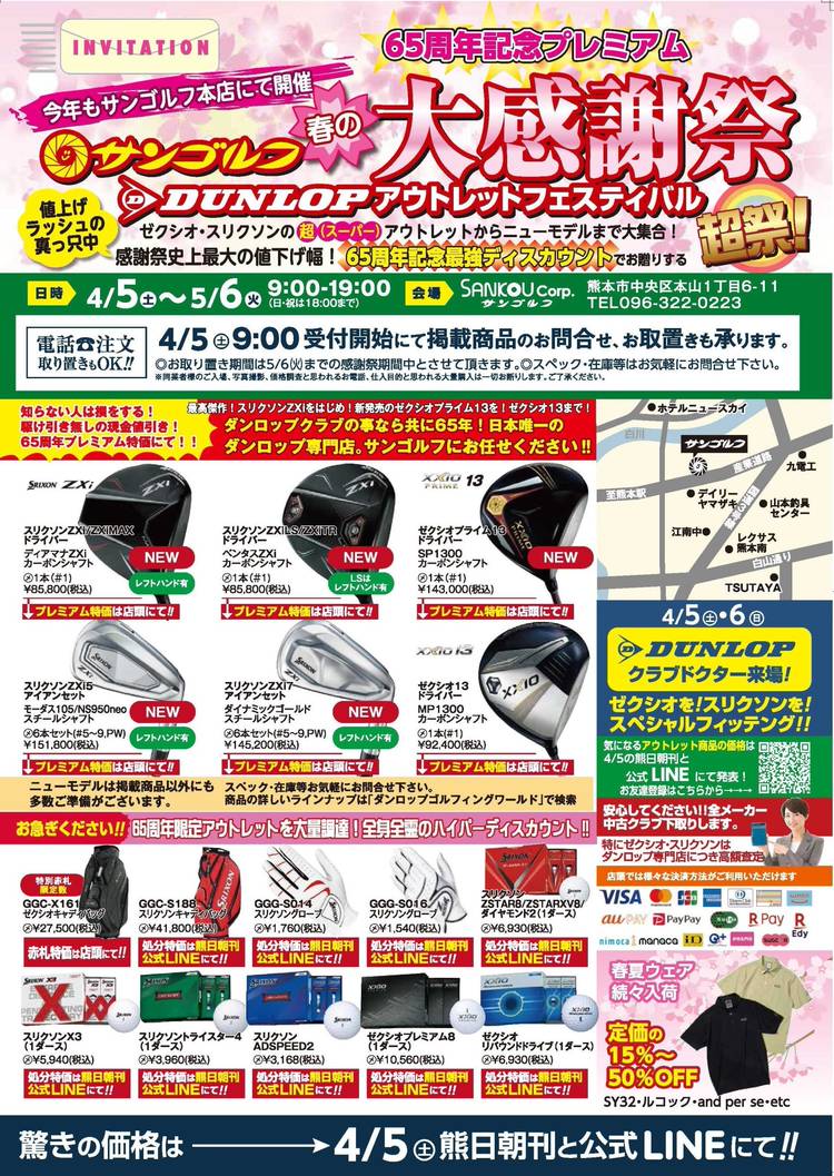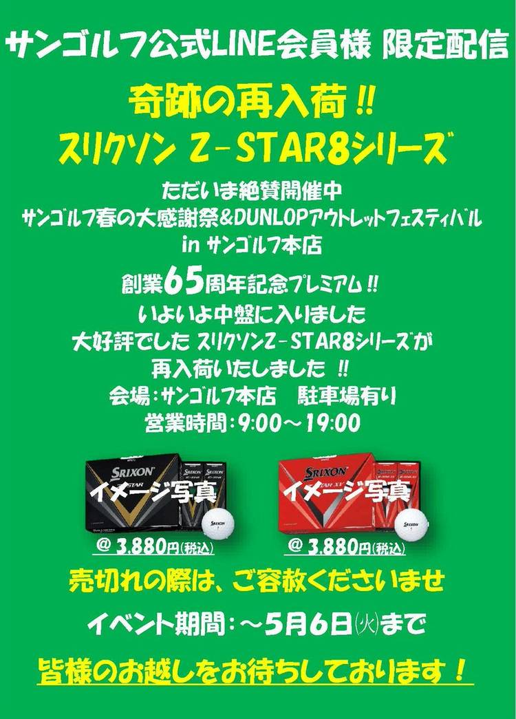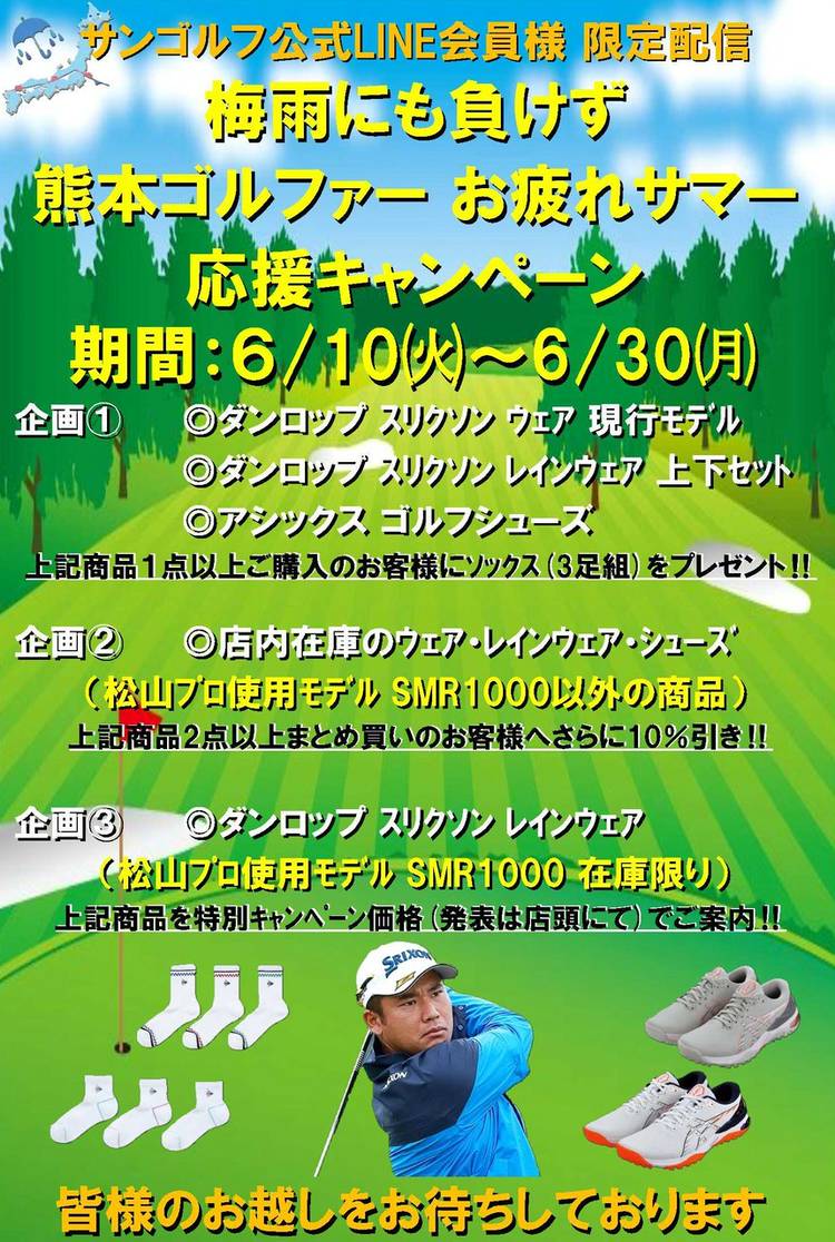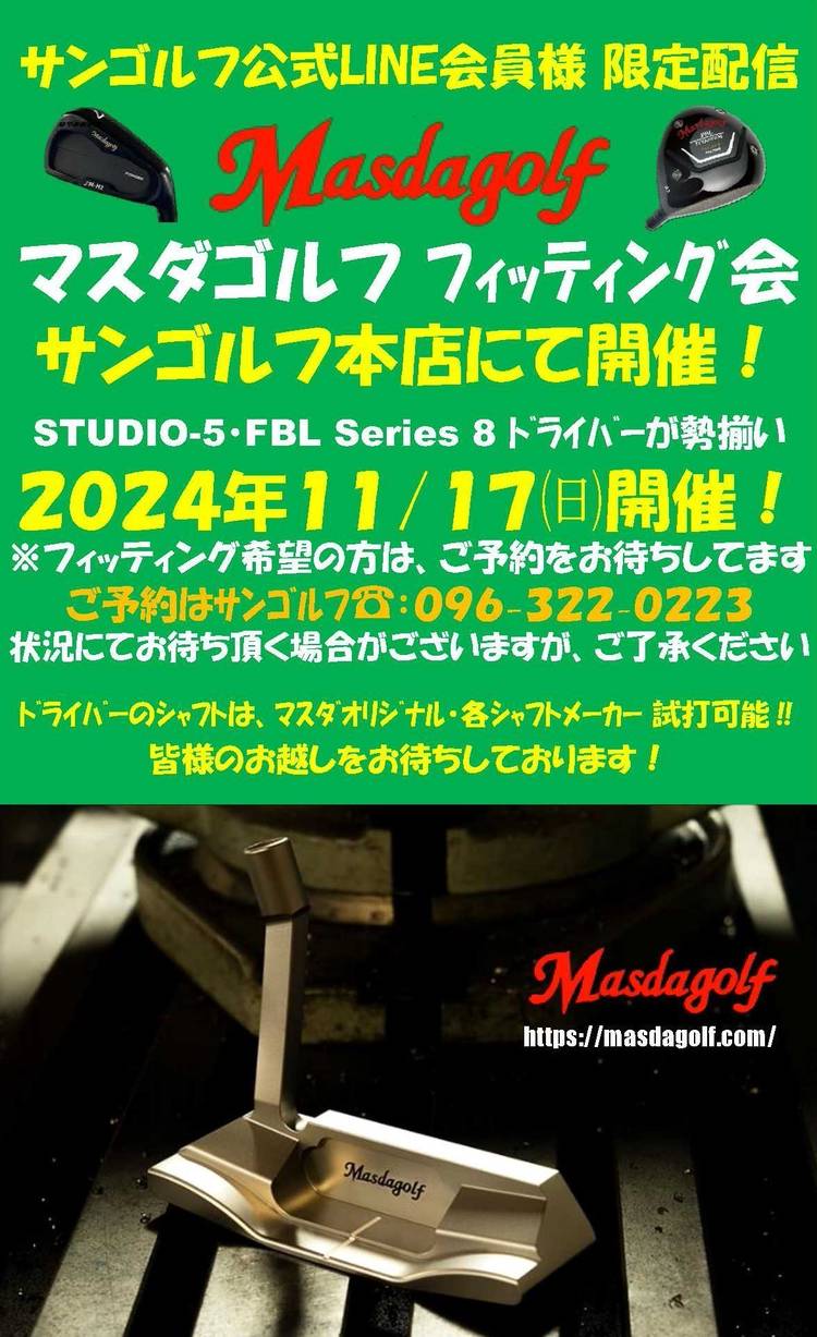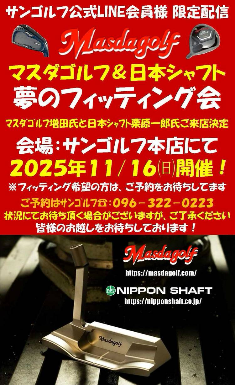 予約状況 マスダゴルフ増田氏と 日本シャフト栗原一郎氏のコラボ 夢のフィッティング会 大好評につき、午前中のご予約は満員になりました。 午後の14時からの枠に空きがございます。 ご予約をお待ちしております。 11/16㈰【要予約】 14時~17時まで お1人様30分予定 会場:サンゴルフ本店 駐車場有り 皆様のお越しをお待ちしております 営業時間:9:00~ 日・祝日は18時まで...