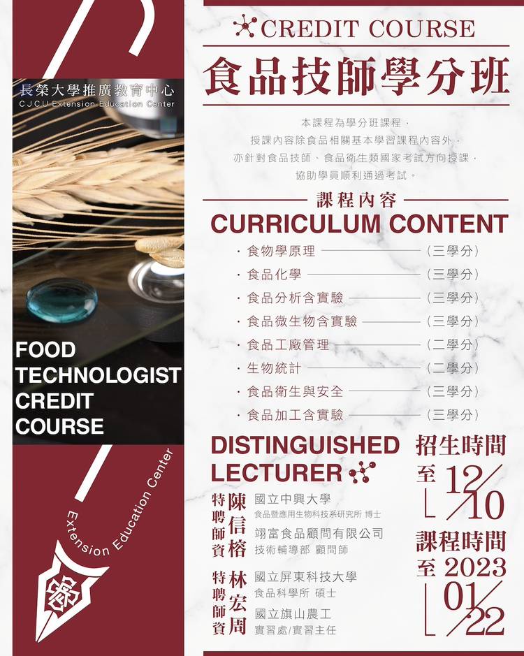 [ #食品技師 要成為食品技師所需要的學分 通通都來長榮大學推廣教育中心就對了!!!] 本課程的課程採取檢定『題組教學』與『實際操作』 👫特色簡介 ✅小修完本課程,學生除習得食品技師相關核心科目之專業知識,也具備應考國家食品衛生類相關考試與食品技師專技高考之能力。 ✅本課程為學分班課程,授課內容除食品相關基本學習課程內容外,亦針對食品技師、食品衛生類國家考試方向授課,協助學員順利通過考試 �...