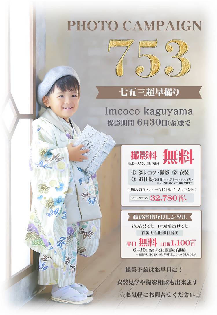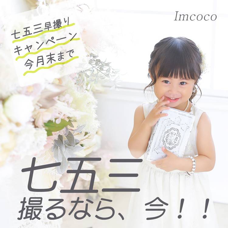 【七五三早撮り受付中!】 今だけの特別キャンペーン! 6月30日まで七五三早撮りフォト受付中です。 今年の新作衣装も入荷しています♪ 混み合う秋より、ゆったり撮影&お得に思い出を残しませんか? 愛知県日進市のフォトスタジオ「Imcoco 香久山」なら お値打ち価格で高品質な撮影をご提供します。 まずはお気軽にお問い合わせください! 七五三相談会ご希望のお客様↓ https://totoco-...
