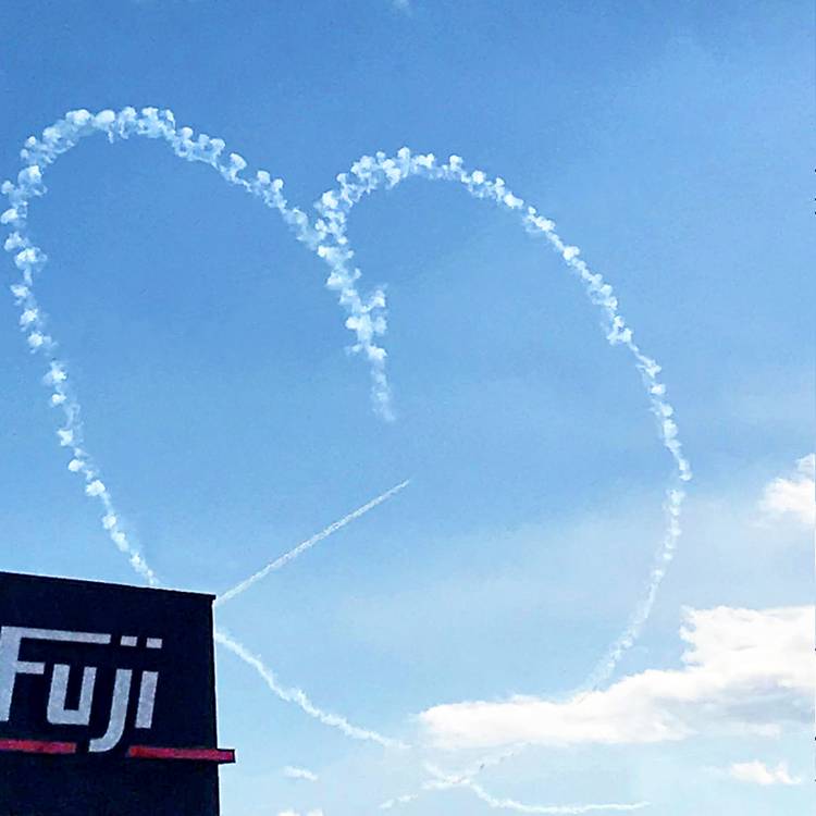 本日フジ石巻店上空でブルーインパルスが大空にハートマークを描くアクロバット飛行が行われました