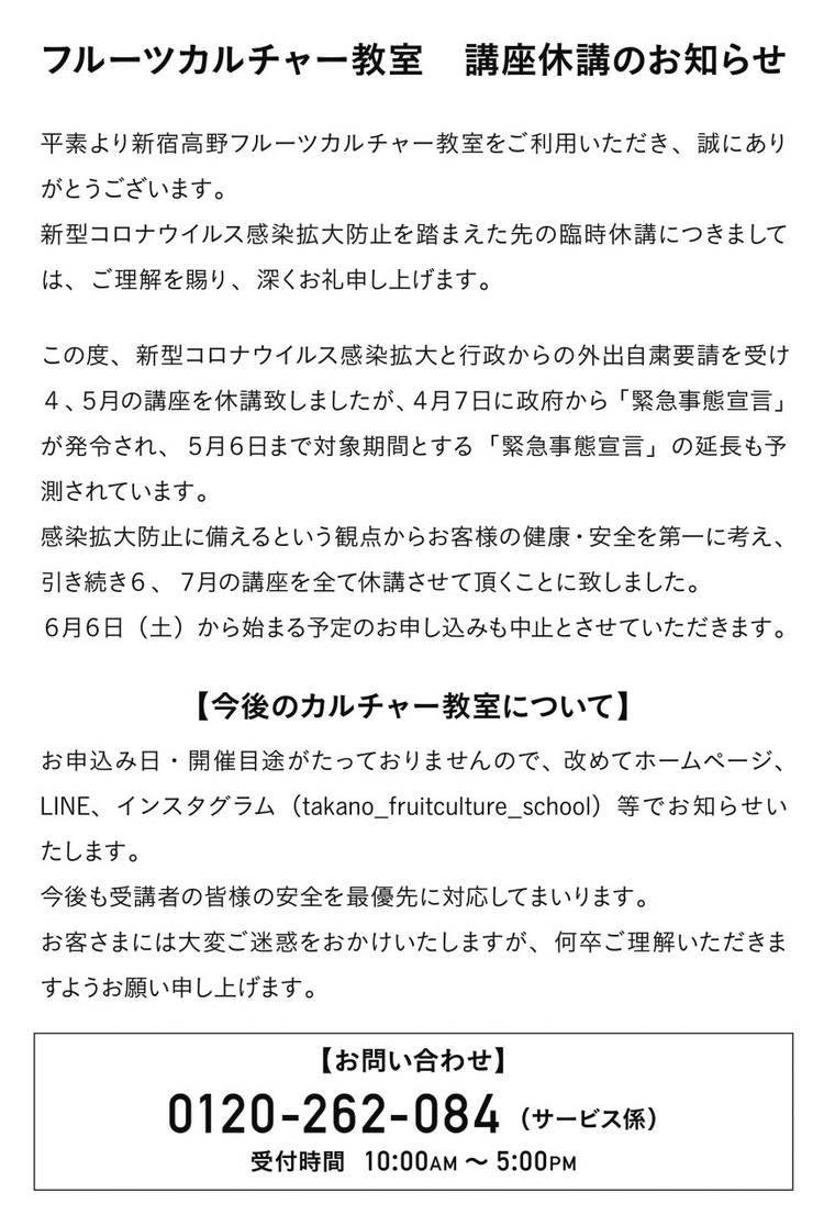 【営業時間】 B1F タカノフルーツギフトフロア 10:00AM~8:00PM B2F タカノオリジナルフード&ギフトフロア 10:00AM~8:30PM (※日曜日は 8:00PMまで) 「新宿高野本店」のLINE公式アカウントです。 季節のイベントや最新情報をお届けいたします。 ※新宿高野本店 B1・B2フロア(パフェリオ本店を除く)の情報をお届けします。