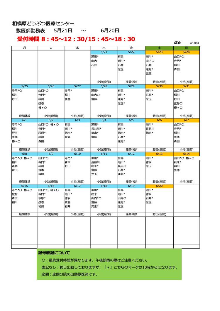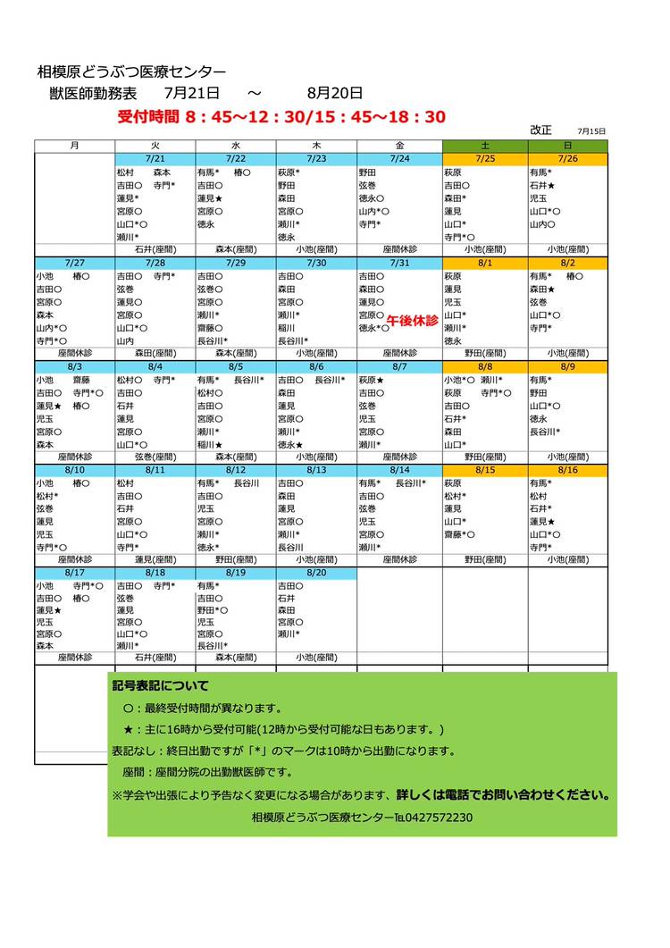 📢10月度獣医師勤務表📢 9月21日以降の獣医師勤務予定をアップしました。ご予約はお電話でお待ちしております。 現在、新型コロナウイルス感染拡大防止のため予約制、入場制限、マスク着用、お車でのお待ちいただく等を実施しております。ご理解協力お願いいたします。【9月15日7:00更新】