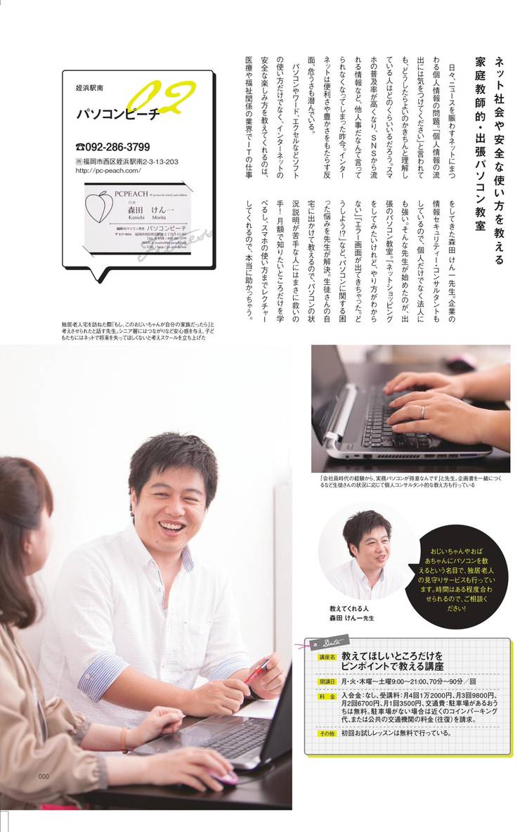 パソコンピーチはこれまでなかった近所の出張パソコン教室として、福岡市で地域貢献をしています。 「パソコンの家庭教師」 安価な料金で自宅でパソコン学習をゆっくりできると、特に忙しい主婦の方やご年配の方にご好評をいただいております。 「お店のオーナー様のパソコン相談」 また、個人商店や法人の方々からもホームページの依頼やパソコンの活用についての相談もいただいており、地域で働く方々をサポートしております。 「パソコンのトラブル解決」 スマホの操作やプリンタの設置などパソコン以外の機器もお任せください。もちろん、トラブル相談も受け付けております。 ”急に動かなくなった” ”ネットに繋がらない”など 面倒事は一手に引き受け、お客様が安心して、安全にパソコンを試用できるように、”分かりやすく丁寧に”対応しています。 パソコンで”イライラ”している方は是非、いっしょに”スッキリ”しましょう!
