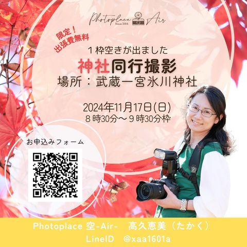 平日41,800円 土日祝日47,300円 B5Qサイズ4pのアルバム付 神社を入る所から出る所までご一緒します その他、ライトプラン等ございます HPをご覧ください