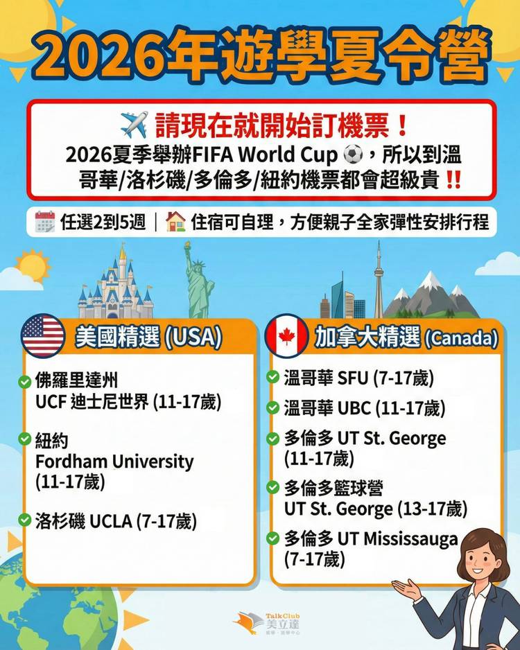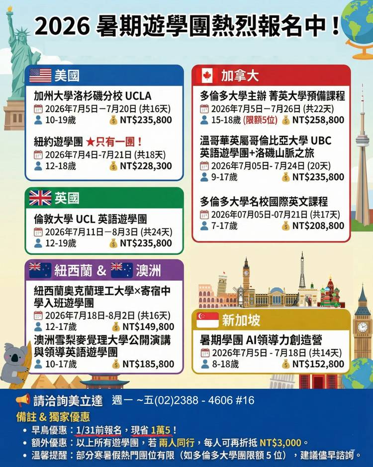 今天初三睡到飽,起來滑滑手機,計畫暑假出國現在已經不算早囉! 🏖️ 關鍵提醒: 暑期熱門遊學夏令營(美、英、加)的優惠與名額通常在 2、3 月就會截止! 今年世界盃足球賽在北美各地展開,連機位也要搶呢! 快聯絡我們保留諮詢位子,趕快來選擇你的遊學目的地吧: ✅遊學夏令營 https://pse.is/75r2cg ✅UCI語校 遊學 https://pse.is/7cjp4x ✅名校大學...