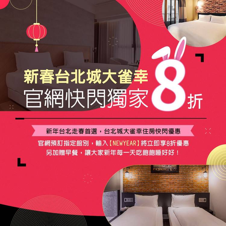2023農曆春節 入住雀客最優惠!🎉 「雀定與您兔GETHER!」🐰 眾所矚目的農曆春節住宿優惠來囉! 春節住宿首選雀客,讓您新春一路發🧨🧨🧨 👉即日起至12/16開放預訂 於預訂期間,預訂2023/01/20~01/29入住雀客旅館「北區限定館別」就可以享有現金折扣!🤑 ✅雀客旅館、雀客藏居系列輸入優惠碼「CNY888」 不限房型金額立即現折$888元! ✅雀客快捷系列輸...