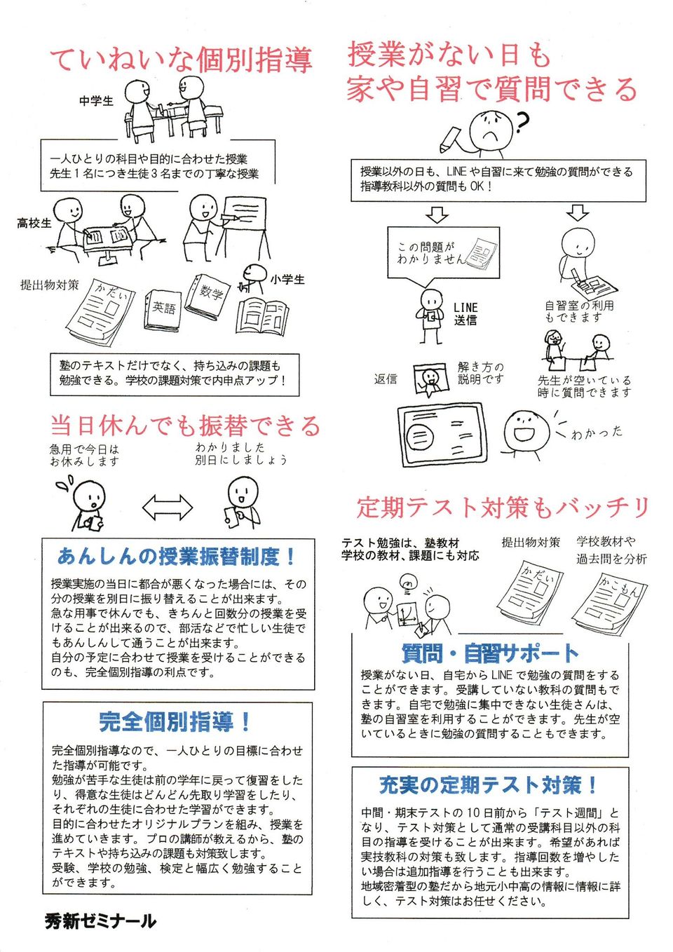 小・中・高・卒生対象の個別指導塾です。 先生1人に対して生徒3人まで。1人1人の能力や目的に応じて、丁寧な指導を心がけています。