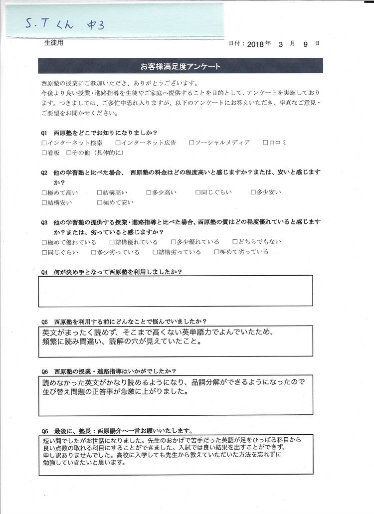 西原塾は生徒の性格や 理解力に合わせて丁寧に指導する 落ちこぼれ指導特化の塾です。 「成績が低い」 「塾や学校の授業についていけない」 「どこから勉強したら良いかわからない」 といった、落ちこぼれの中学生・高校生への 指導に特化した学習塾です。 塾のカリキュラムに生徒を ただ従わせるのではなく、 「どうすれば授業についてこれるか」 「なにが原因で勉強しないのか」 「どうして成績が低いのか」 などを生徒ひとりひとり分析し、 どんなレベルの生徒でも 授業を完璧に理解して 成績を上げられるよう 個人個人に適切な指導を行います。 もちろん、ただ生徒に合わせて 授業をするだけではありません。 生徒が授業を理解できるペースに 合わせつつ、その中で なるべく短期間のうちに 学年最上位レベルへ引き上げます。 最大3名までの集団授業か、 塾長と1:1の個別授業という、 超少人数制を掲げ、 生徒一人ひとりに手厚い指導が 行き届くよう気をつけています。 指導科目は中学生・高校生ともに 英・国・社(日本史・世界史)です。 高校生の英・国・社は、 入塾時の学力を問わず 10ヶ月で成績をゼロから G-MARCH・関関同立以上合格へ 引き上げることを保証しています。 中学1年生から高校3年生 (高校生は浪人生・通信制・大検含む) までの英・国・社が苦手で 悩んでいる子を募集しています。 最大3名までの 超少人数制集団授業と、 塾長に対して生徒1名のみで マンツーマン制の授業をする 完全個別授業の2つの授業形態があります。 通塾する場合の最寄り駅は 東武伊勢崎線せんげん台駅、 または大袋駅です。 場所はこちら 教室へ直接通えない生徒には SkypeやLINEのテレビ電話でも 授業をしています。