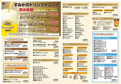 ~食べ放題~ 定番コース¥2500,厳選コース¥3000,特上コース¥3500 (全て税抜き価格) ~飲み放題~ ソフトドリンク飲み¥600,のどごし生飲み放題¥1000,一番搾り飲み放題¥1300 (全て税抜き価格)