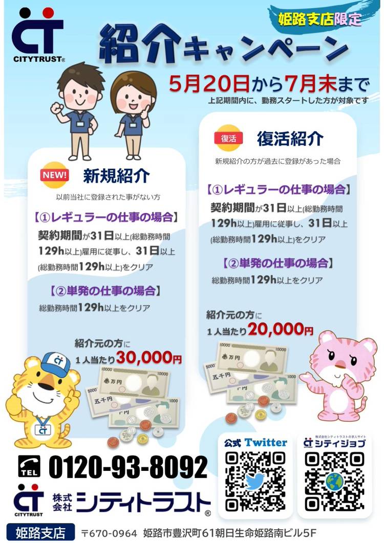 姫路にある人材派遣会社シティトラストです。 皆様一人一人の情熱を惜しみなく発揮できる職場を、多数ご紹介しております。 一般事務・経理事務・CAD・倉庫内作業・製造・組立・仕分け・検品・フォークリフト作業・介護など幅広いお仕事をご紹介。 長期・短期・1日のみ単発。 お問い合わせ 0120-93-8092までお願いします。