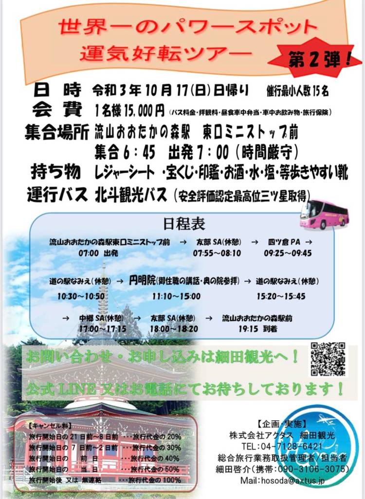 世界一のパワースポットと言われる福島円明院の運気好転ツアーに行きませんか❓ 9月の第一弾は大変御好評いただきました✨ 感染対策バッチリの貸切バスでコロナに負けず運気を上げに行きましょう🤩 是非ご参加ください😊
